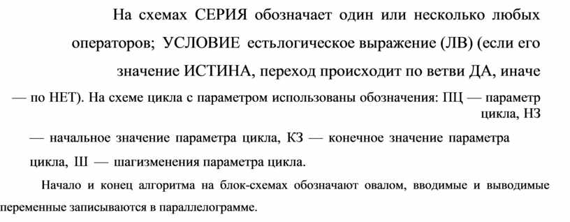 На схемах СЕРИЯ обозначает один или несколько любых операторов; УСЛОВИЕ есть логическое выражение (ЛВ) (если его значение ИСТИНА, переход происходит по ветви ДА, иначе