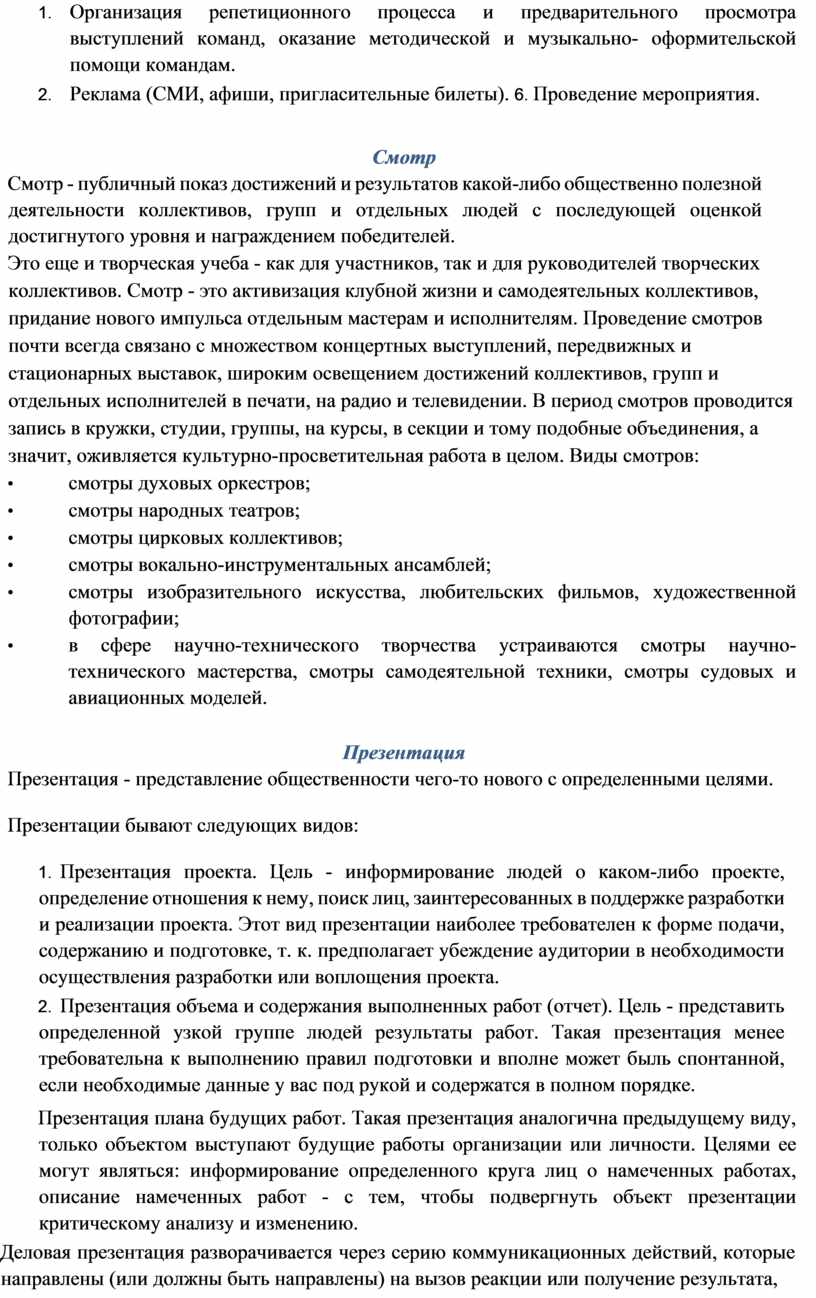 8. Постановка мероприятия (распределение обязанностей среди членов группы, подготовка музыкального оформления, реквизита, костюмов, декораций, репетиционный период). 9. Проведение мероприятия.