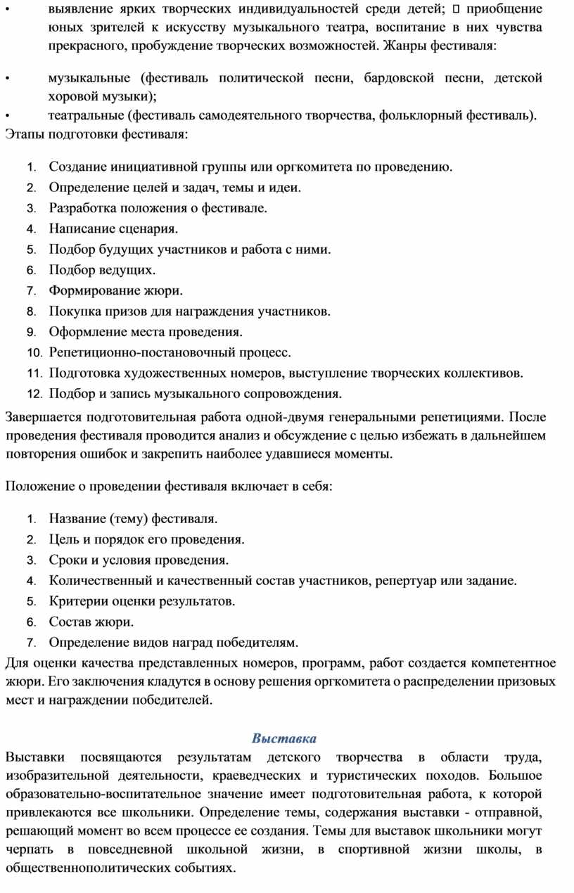 Положение о проведении фестиваля включает в себя: