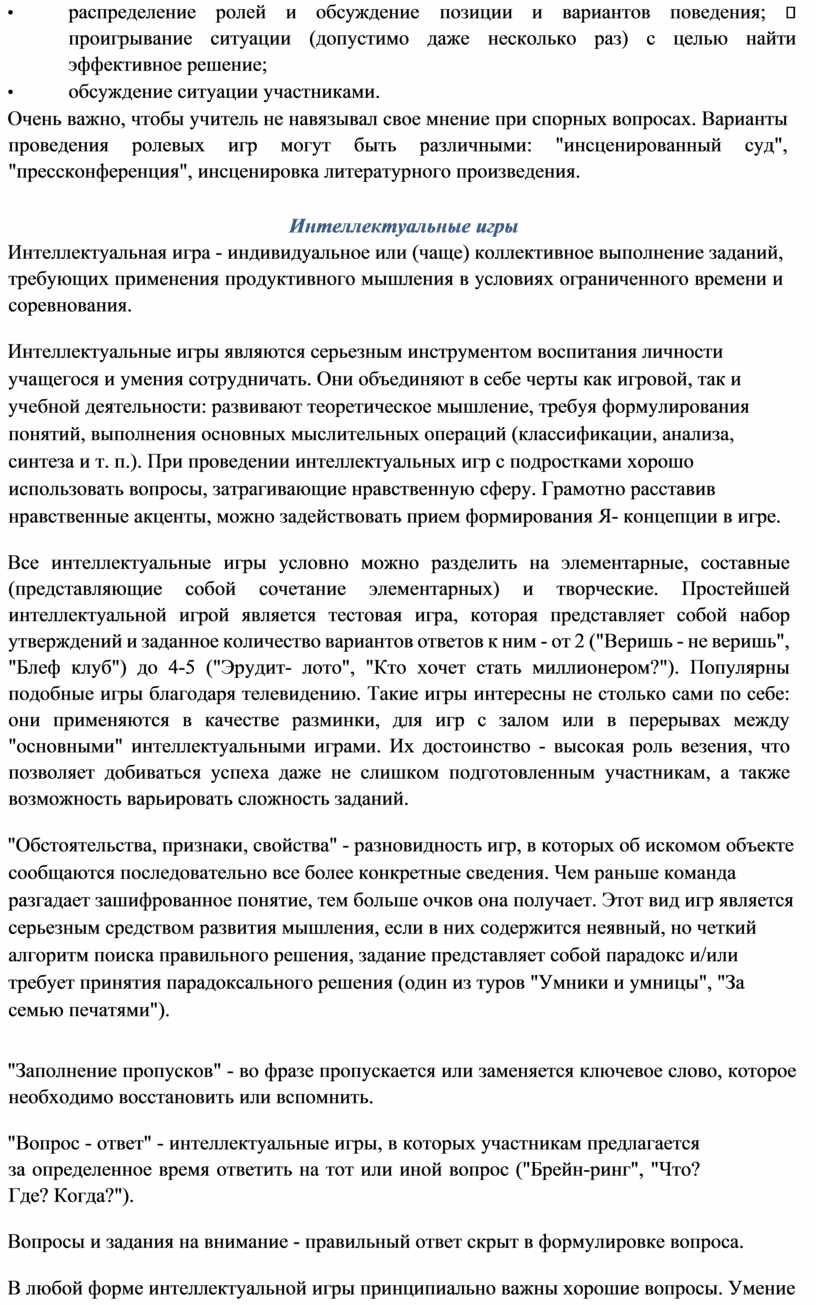 Интеллектуальные игры являются серьезным инструментом воспитания личности учащегося и умения сотрудничать. Они объединяют в себе черты как игровой, так и учебной деятельности: развивают теоретическое мышление, требуя формулирования понятий, выполнения основных мыслительных операций (классификации, анализа, синтеза и т. п.). При проведении интеллектуальных игр с подростками хорошо использовать вопросы, затрагивающие нравственную сферу. Грамотно расставив нравственные акценты, можно задействовать прием формирования Я- концепции в игре.