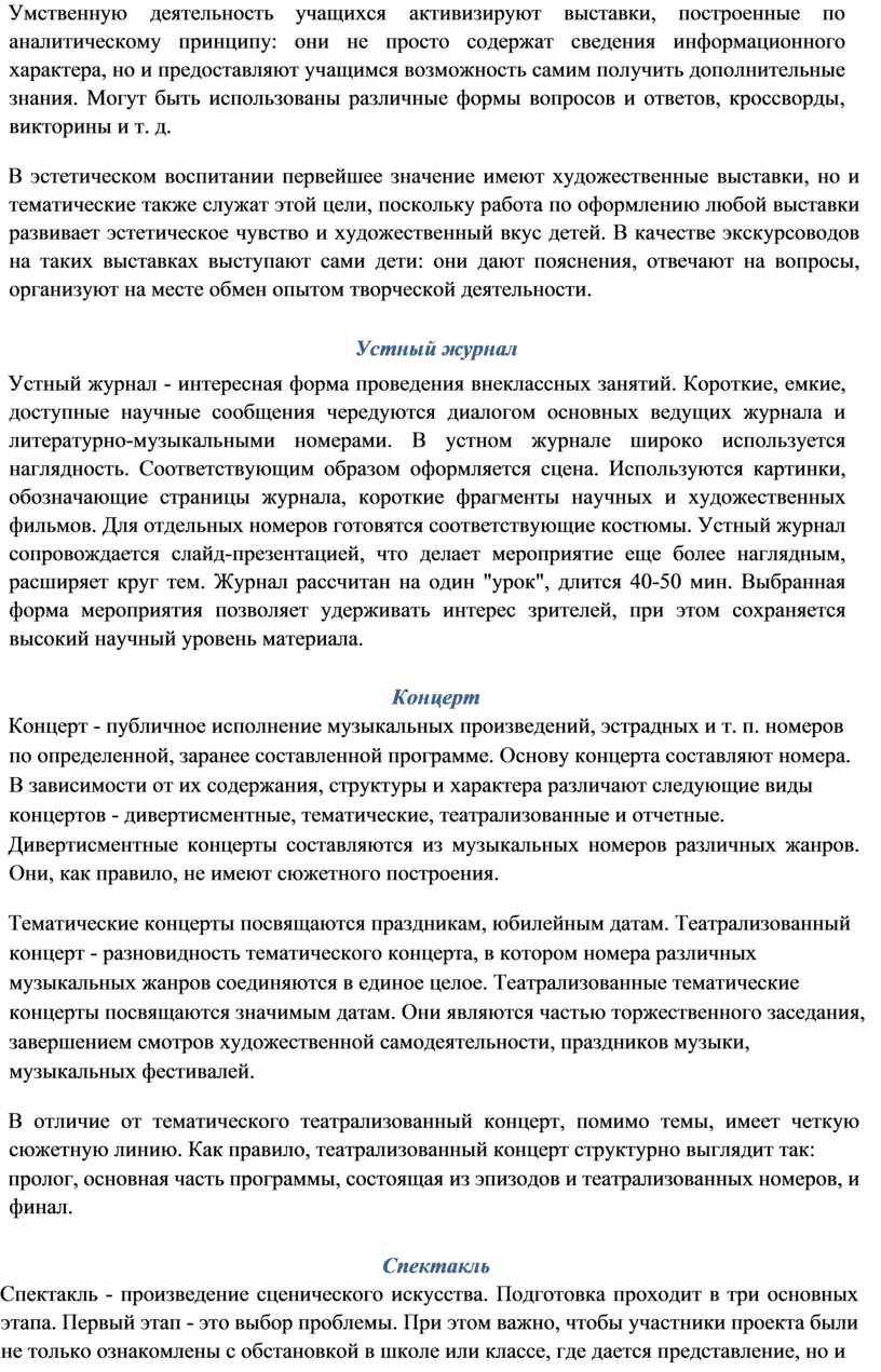 Умственную деятельность учащихся активизируют выставки, построенные по аналитическому принципу: они не просто содержат сведения информационного характера, но и предоставляют учащимся возможность самим получить дополнительные знания. Могут быть использованы различные формы вопросов и ответов, кроссворды, викторины и т. д.