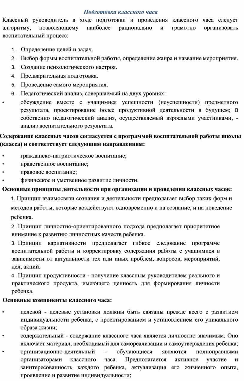 Классный руководитель в ходе подготовки и проведения классного часа следует алгоритму, позволяющему наиболее рационально и грамотно организовать воспитательный процесс: