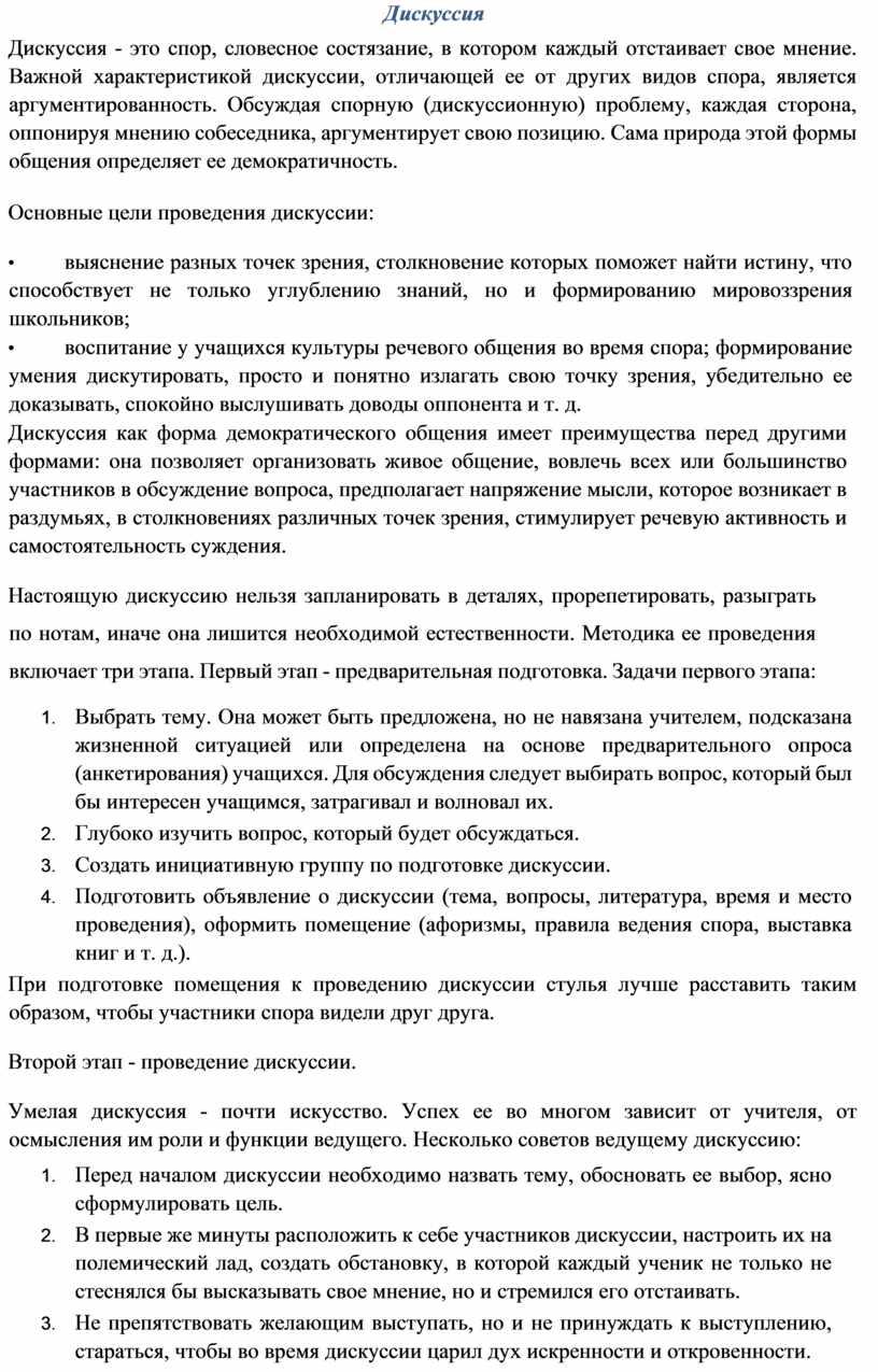 Умелая дискуссия - почти искусство. Успех ее во многом зависит от учителя, от осмысления им роли и функции ведущего. Несколько советов ведущему дискуссию: