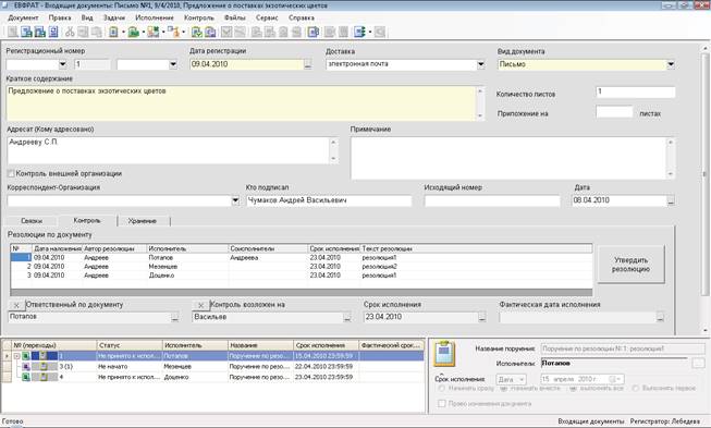 Заполняемые на экране регистрационные формы для входящих, исхо- дящих и внутренних документов имеют небольшие отличия, но вносимые в общую базу данных сведения позволяют осуществлять обобщенный поиск по всем документам организации.