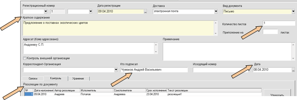 1. Поля, заполняемые вручную (номер и дата входящего документа, краткое содержание, текст резолюции).