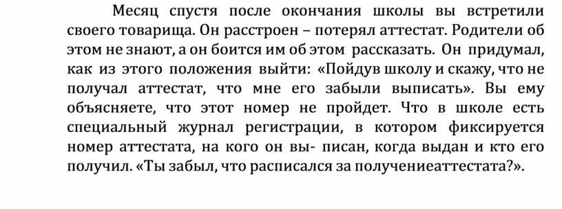 Месяц спустя после окончания школы вы встретили своего товарища. Он расстроен – потерял аттестат. Родители об этом не знают, а он боится им об этом рассказать. Он придумал, как из этого положения выйти: «Пойду в школу и скажу, что не получал аттестат, что мне его забыли выписать». Вы ему объясняете, что этот номер не пройдет. Что в школе есть специальный журнал регистрации, в котором фиксируется номер аттестата, на кого он вы- писан, когда выдан и кто его получил. «Ты забыл, что расписался за получение аттестата?».