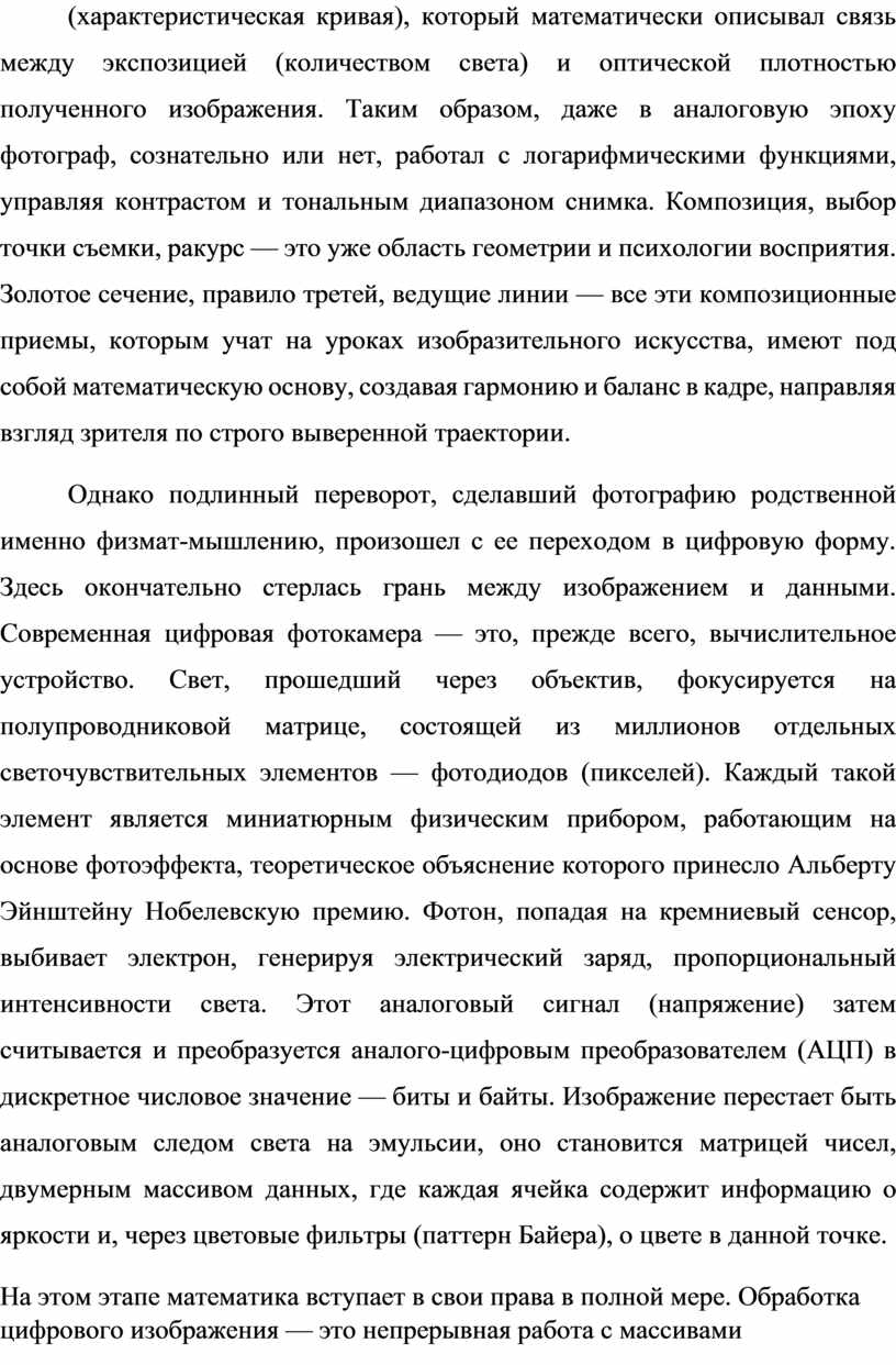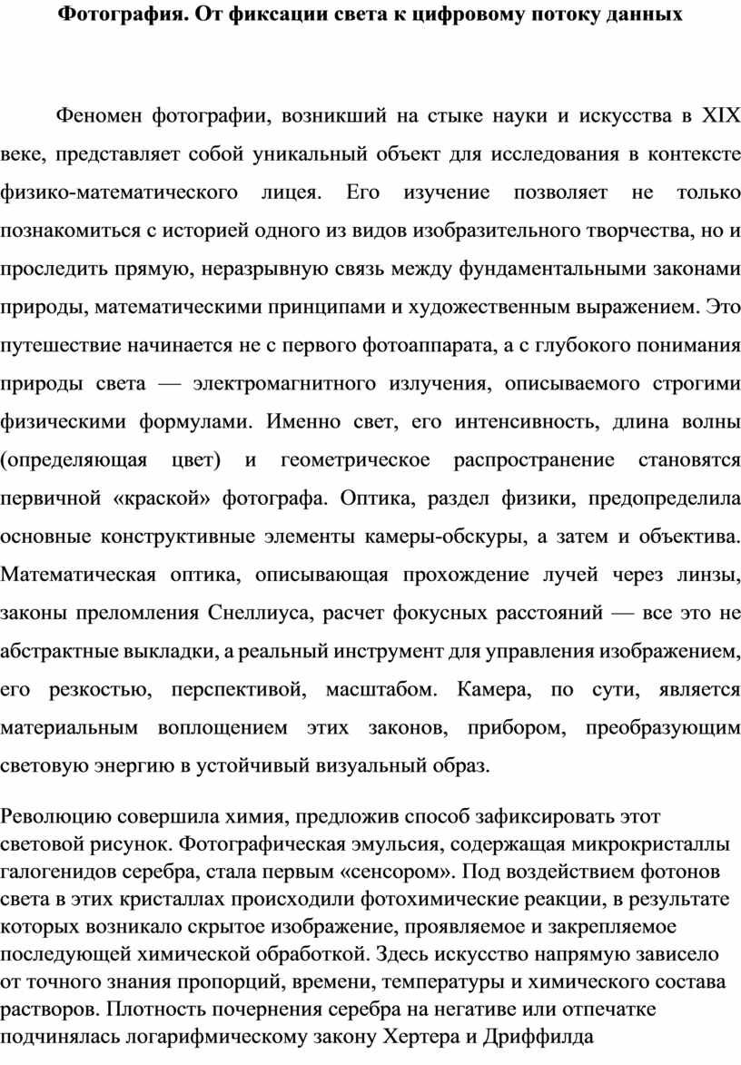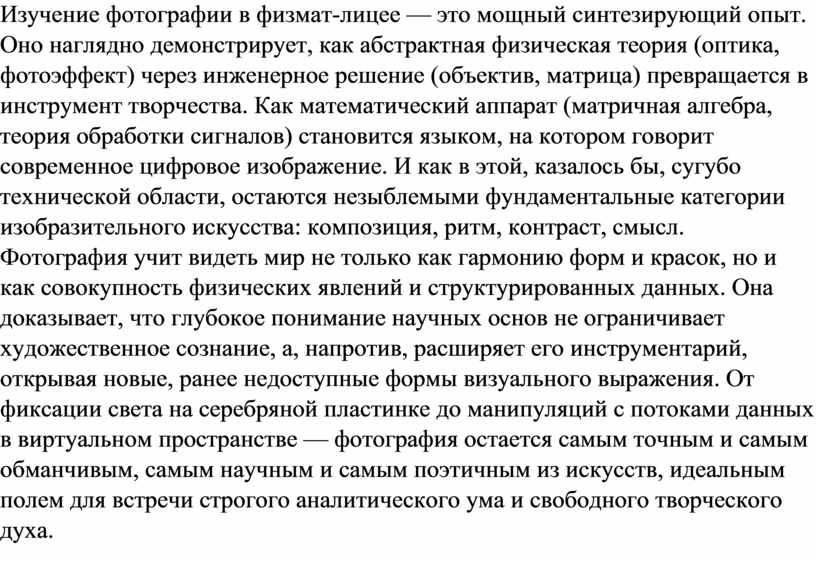 Изучение фотографии в физмат-лицее — это мощный синтезирующий опыт. Оно наглядно демонстрирует, как абстрактная физическая теория (оптика, фотоэффект) через инженерное решение (объектив, матрица) превращается в инструмент творчества. Как математический аппарат (матричная алгебра, теория обработки сигналов) становится языком, на котором говорит современное цифровое изображение. И как в этой, казалось бы, сугубо технической области, остаются незыблемыми фундаментальные категории изобразительного искусства: композиция, ритм, контраст, смысл. Фотография учит видеть мир не только как гармонию форм и красок, но и как совокупность физических явлений и структурированных данных. Она доказывает, что глубокое понимание научных основ не ограничивает художественное сознание, а, напротив, расширяет его инструментарий, открывая новые, ранее недоступные формы визуального выражения. От фиксации света на серебряной пластинке до манипуляций с потоками данных в виртуальном пространстве — фотография остается самым точным и самым обманчивым, самым научным и самым поэтичным из искусств, идеальным полем для встречи строгого аналитического ума и свободного творческого духа.