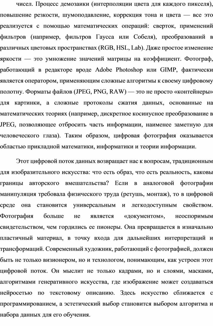 На этом этапе математика вступает в свои права в полной мере. Обработка цифрового изображения — это непрерывная работа с массивами чисел. Процесс демозаики (интерполяции цвета для каждого пикселя), повышение резкости, шумоподавление, коррекция тона и цвета — все это реализуется с помощью математических операций: сверток, применений фильтров (например, фильтров Гаусса или Собеля), преобразований в различных цветовых пространствах (RGB, HSL, Lab). Даже простое изменение яркости — это умножение значений матрицы на коэффициент. Фотограф, работающий в редакторе вроде Adobe Photoshop или GIMP, фактически является оператором, применяющим сложные алгоритмы к своему цифровому полотну. Форматы файлов (JPEG, PNG, RAW) — это не просто «контейнеры» для картинки, а сложные протоколы сжатия данных, основанные на математических теориях (например, дискретное косинусное преобразование в JPEG, позволяющее отбросить часть информации, наименее заметную для человеческого глаза). Таким образом, цифровая фотография оказывается областью прикладной математики, информатики и теории информации.