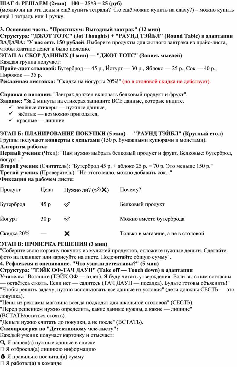· Итог: "Детективы данных, вы справились! Вы не только выбрали завтрак, но и научились игнорировать "информационный шум". Ваше домашнее задание — составить список покупок на 200 рублей, используя рекламную листовку из дневника. Наш девиз на прощание: "Ищем нужное, отбрасываем лишнее!"