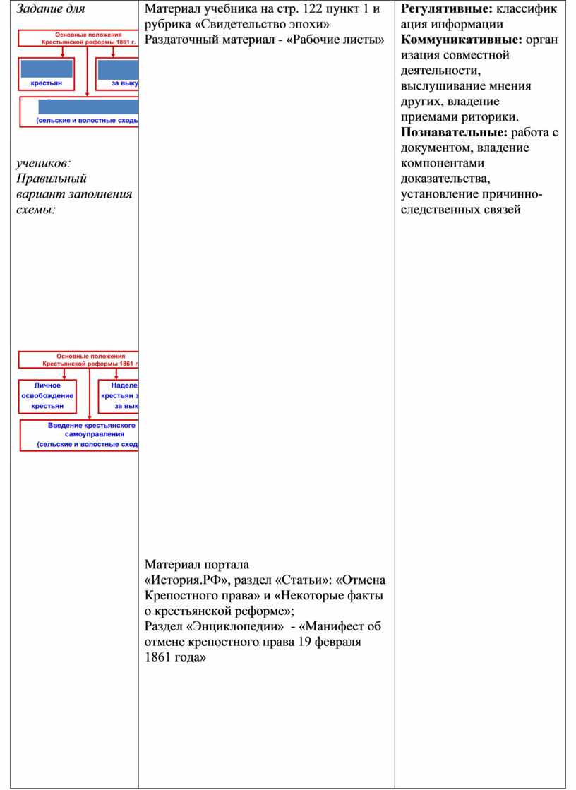 Учитель разделяет класс на 2 социальные группы: 1. консервативные дворяне; 2. крестьяне. Задание группам: - Изучив текст Манифеста от 19 февраля 1861 года, с позиции своей социальной группы укажите, какие стороны реформы вызывают у вас неприятие или опасения, какие внушают оптимизм, оцените необходимость реформы с точки зрения совей социальной группы, попробуйте спрогнозировать, как сложится жизнь данной социальной группы после крестьянской реформы. (Ответы обучающихся)