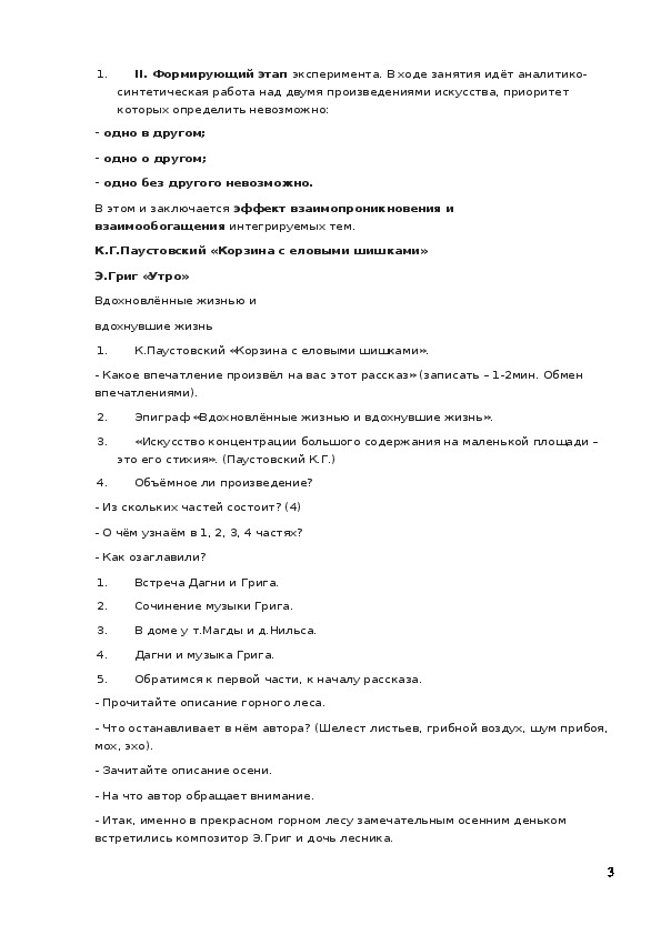 На примере одного из уроков Э.Григ «Утро» - К.Паустовский «Корзина с еловыми шишками» в качестве эксперимента покажем технологию подготовки и проведения такого занятия и отследим эффективность интеграции в формировании художественно-образного восприятия у учащихся. Подготовительная работа заключалась в самостоятельном слушании произведения Э. Грига; в предварительном чтении рассказа Паустовского; в освоении информационного блока.
