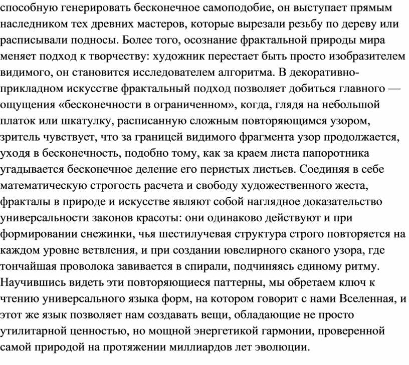 Таким образом, изучение фракталов стирает искусственную границу между «точными» науками и художественным творчеством. Когда современный дизайнер создает принт для ткани, используя компьютерную программу, способную генерировать бесконечное самоподобие, он выступает прямым наследником тех древних мастеров, которые вырезали резьбу по дереву или расписывали подносы. Более того, осознание фрактальной природы мира меняет подход к творчеству: художник перестает быть просто изобразителем видимого, он становится исследователем алгоритма. В декоративно-прикладном искусстве фрактальный подход позволяет добиться главного — ощущения «бесконечности в ограниченном», когда, глядя на небольшой платок или шкатулку, расписанную сложным повторяющимся узором, зритель чувствует, что за границей видимого фрагмента узор продолжается, уходя в бесконечность, подобно тому, как за краем листа папоротника угадывается бесконечное деление его перистых листьев. Соединяя в себе математическую строгость расчета и свободу художественного жеста, фракталы в природе и искусстве являют собой наглядное доказательство универсальности законов красоты: они одинаково действуют и при формировании снежинки, чья шестилучевая структура строго повторяется на каждом уровне ветвления, и при создании ювелирного сканого узора, где тончайшая проволока завивается в спирали, подчиняясь единому ритму. Научившись видеть эти повторяющиеся паттерны, мы обретаем ключ к чтению универсального языка форм, на котором говорит с нами Вселенная, и этот же язык позволяет нам создавать вещи, обладающие не просто утилитарной ценностью, но мощной энергетикой гармонии, проверенной самой природой на протяжении миллиардов лет эволюции.