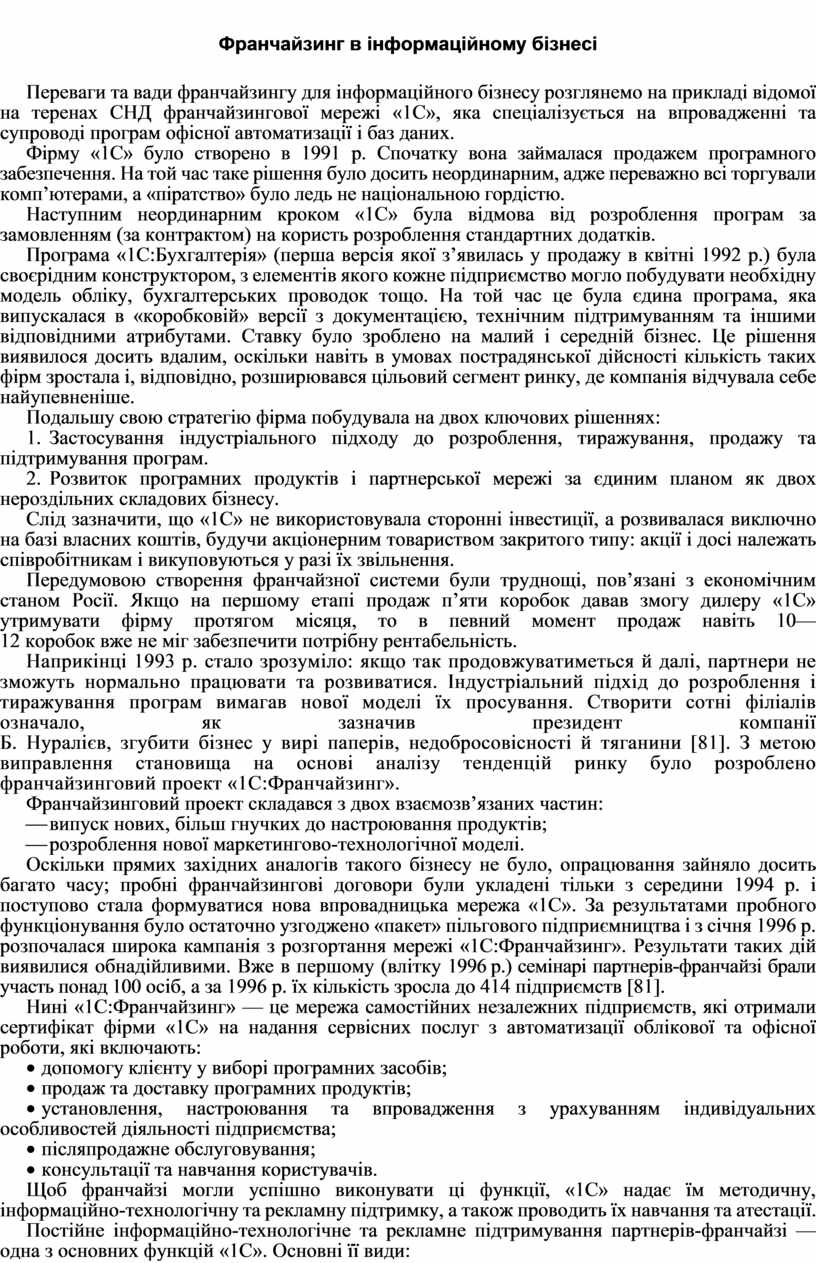 Переваги та вади франчайзингу для інформаційного бізнесу розглянемо на прикладі відомої на теренах СНД франчайзингової мережі «1С», яка спеціалізується на впровадженні та супроводі програм офісної автоматизації і баз даних.