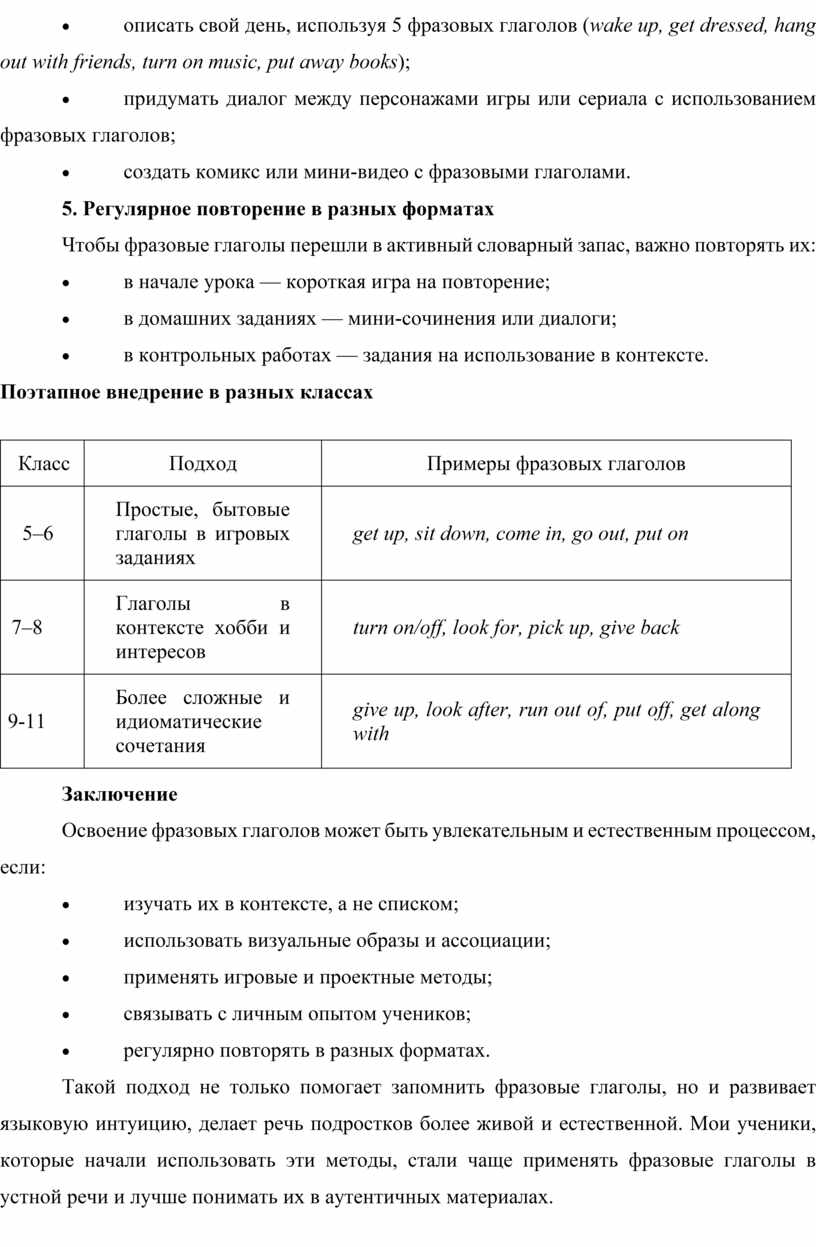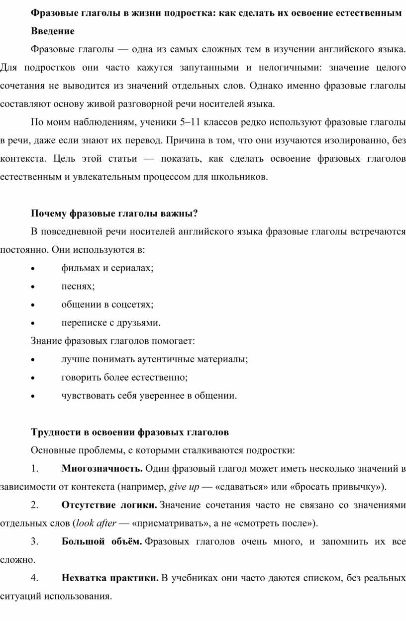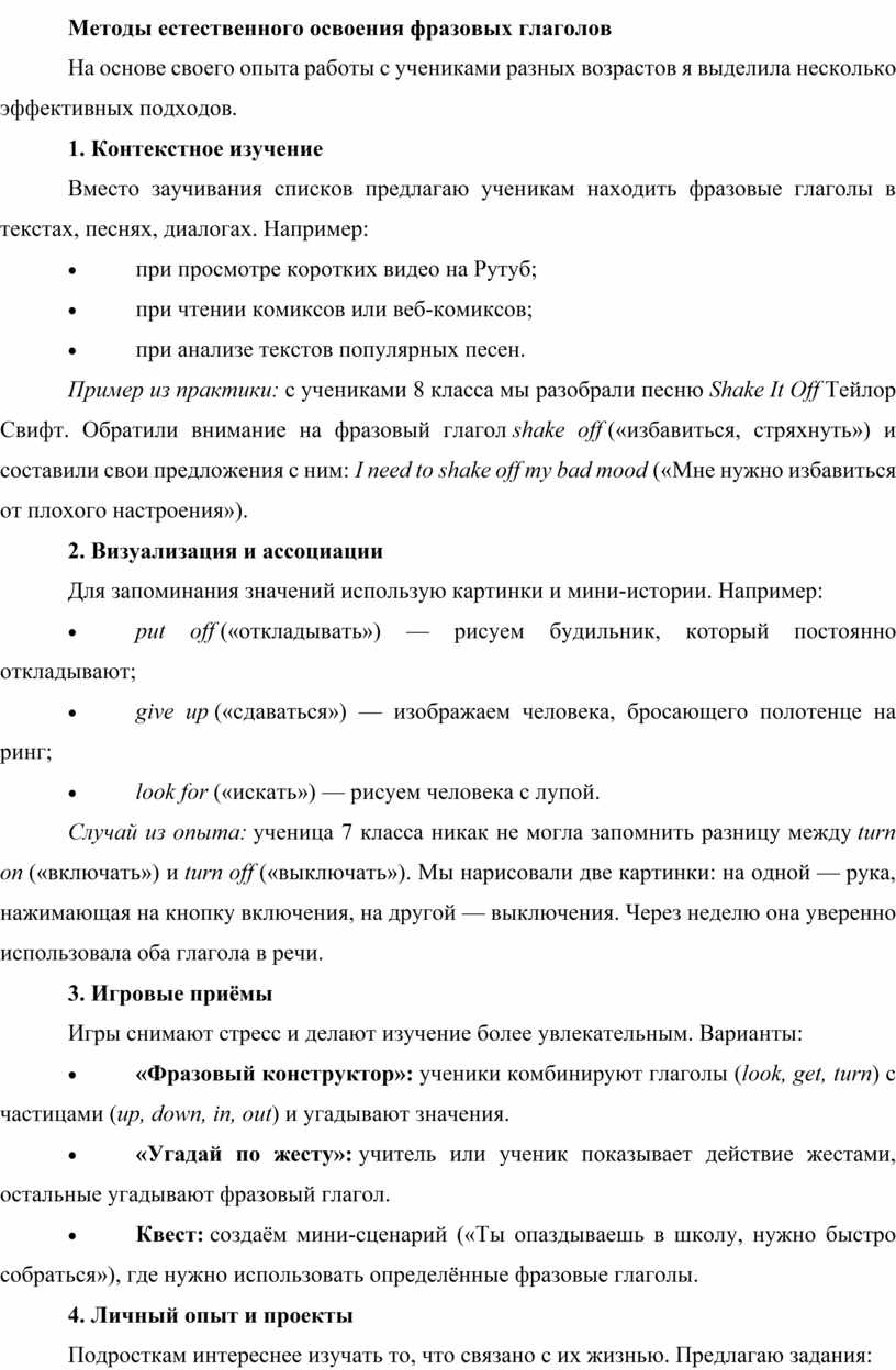 Такой подход не только помогает запомнить фразовые глаголы, но и развивает языковую интуицию, делает речь подростков более живой и естественной. Мои ученики, которые начали использовать эти методы, стали чаще применять фразовые глаголы в устной речи и лучше понимать их в аутентичных материалах.