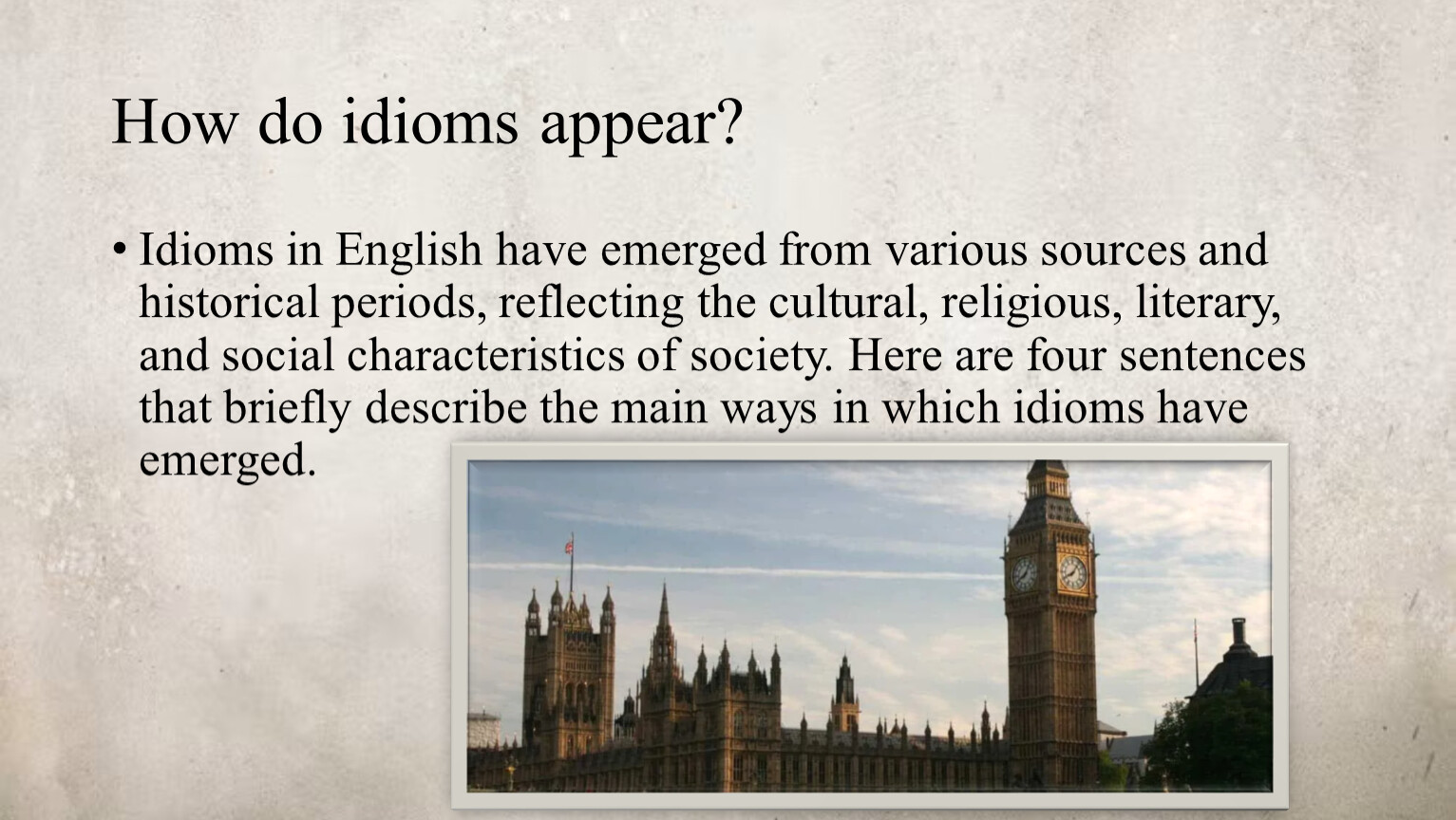 Idioms in English have emerged from various sources and historical periods, reflecting the cultural, religious, literary, and social characteristics of society. Here are four sentences that briefly describe the main ways in which idioms have emerged.