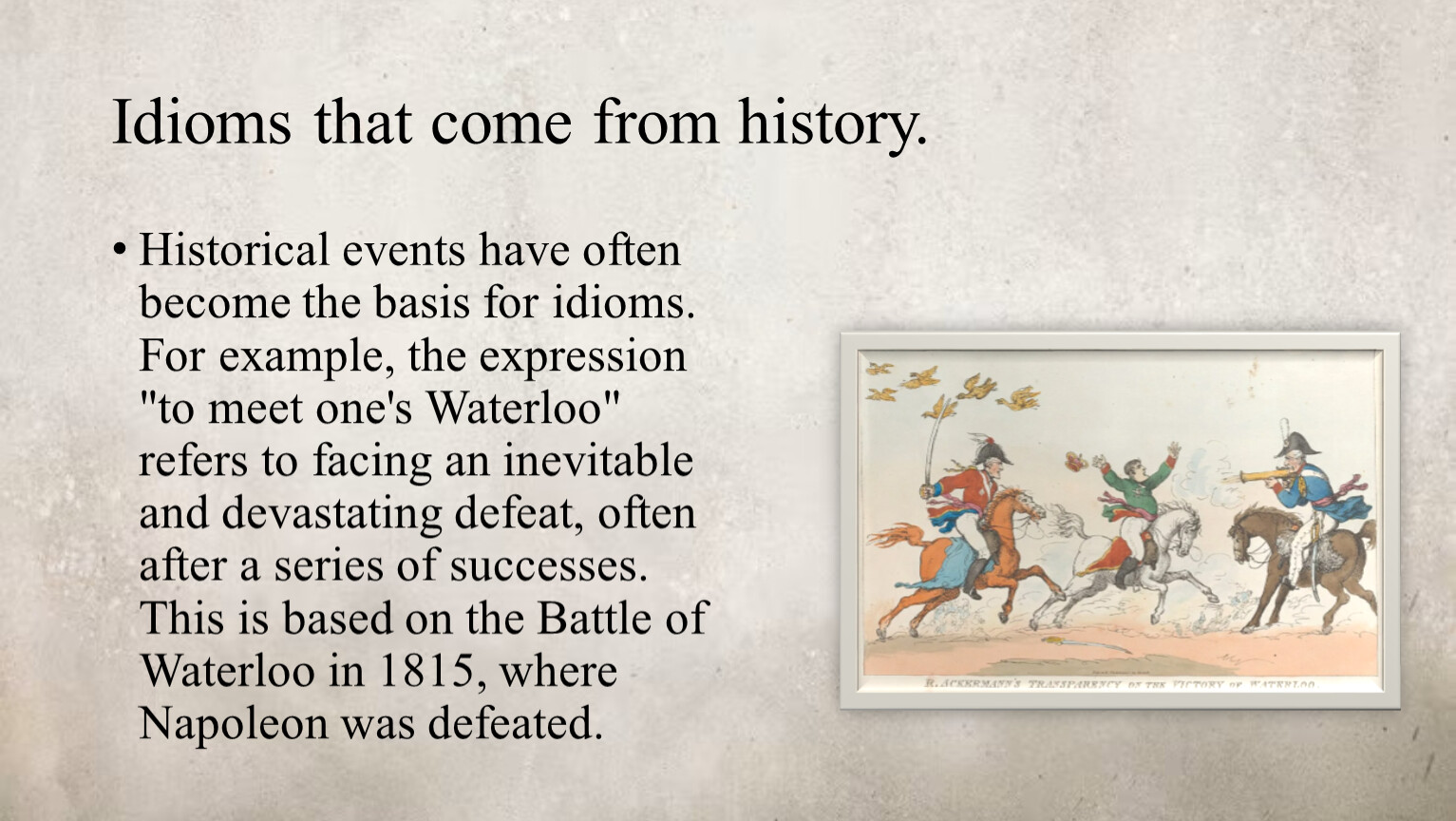 Historical events have often become the basis for idioms. For example, the expression "to meet one's Waterloo" refers to facing an inevitable and devastating defeat, often after a series of successes. This is based on the Battle of Waterloo in 1815, where Napoleon was defeated.