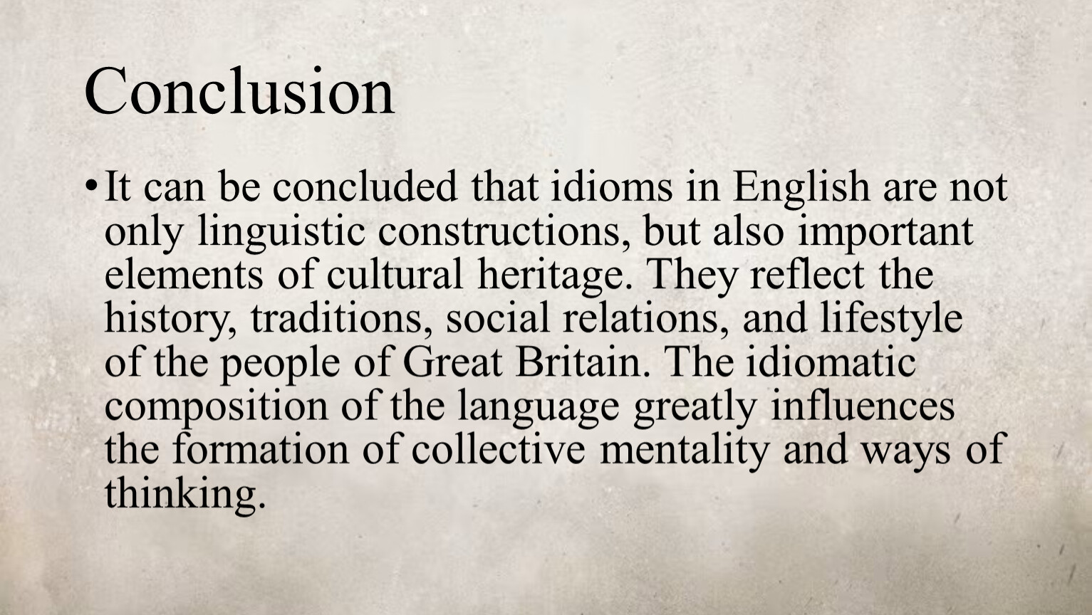 It can be concluded that idioms in English are not only linguistic constructions, but also important elements of cultural heritage. They reflect the history, traditions, social relations, and lifestyle of the people of Great Britain. The idiomatic composition of the language greatly influences the formation of collective mentality and ways of thinking.