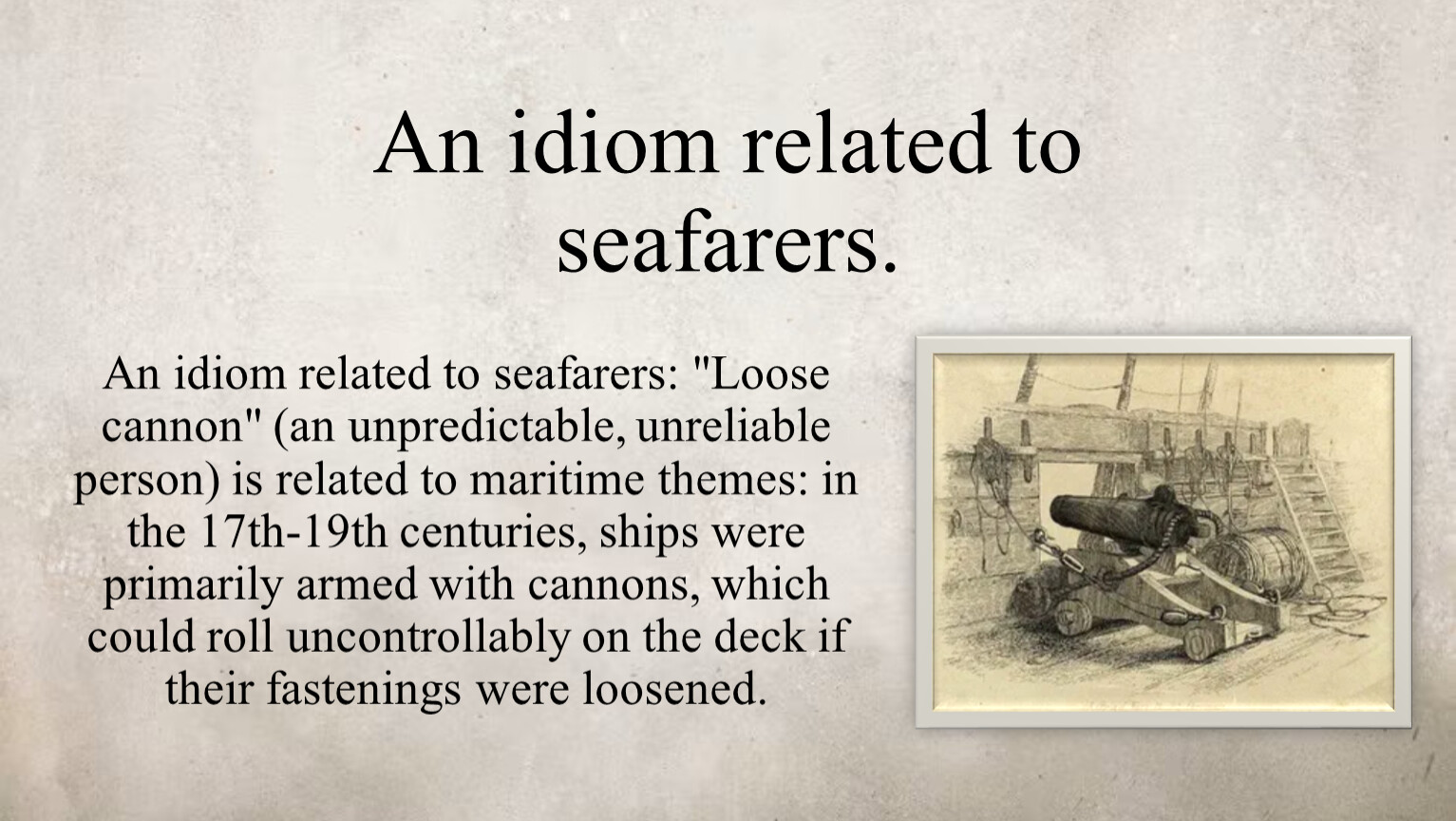An idiom related to seafarers: "Loose cannon" (an unpredictable, unreliable person) is related to maritime themes: in the 17th-19th centuries, ships were primarily armed with cannons, which could roll uncontrollably on the deck if their fastenings were loosened.