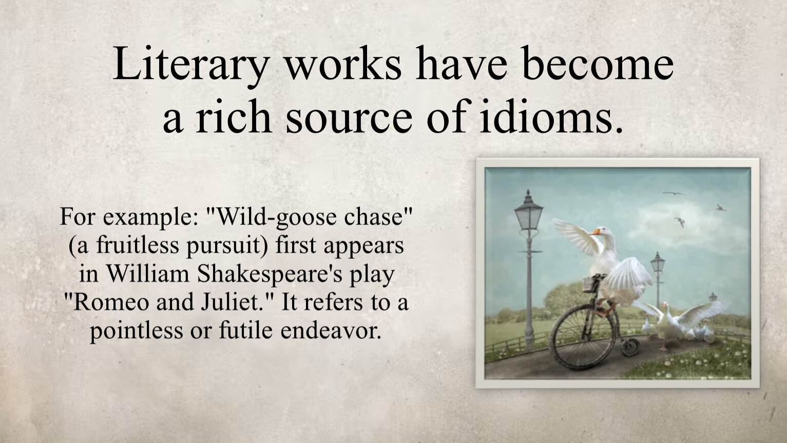 For example: "Wild-goose chase" (a fruitless pursuit) first appears in William Shakespeare's play "Romeo and Juliet." It refers to a pointless or futile endeavor.