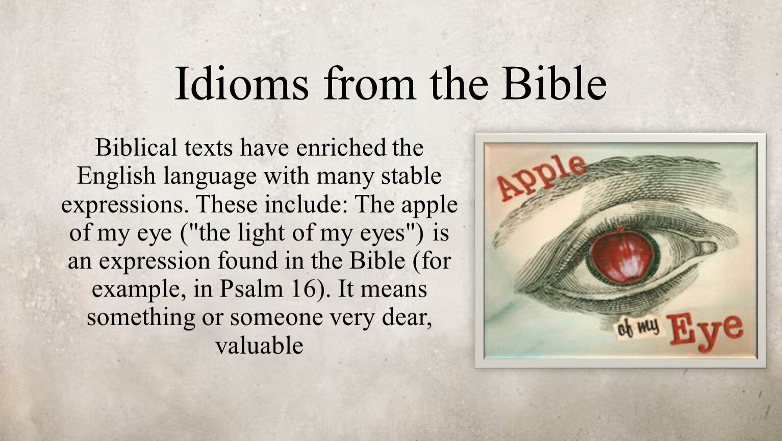 Biblical texts have enriched the English language with many stable expressions. These include: The apple of my eye ("the light of my eyes") is an expression found in the Bible (for example, in Psalm 16). It means something or someone very dear, valuable