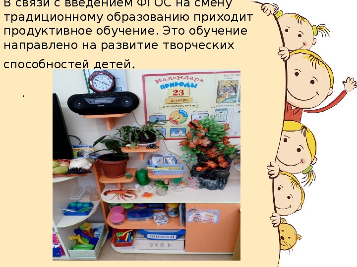 В связи с введением ФГОС на смену традиционному образованию приходит продуктивное обучение. Это обучение направлено на развитие творческих способностей детей .Исследовательская деятельность детей идет с опорой на непосредственный опыт ребенка, на расширение активного освоения мира.Презентация