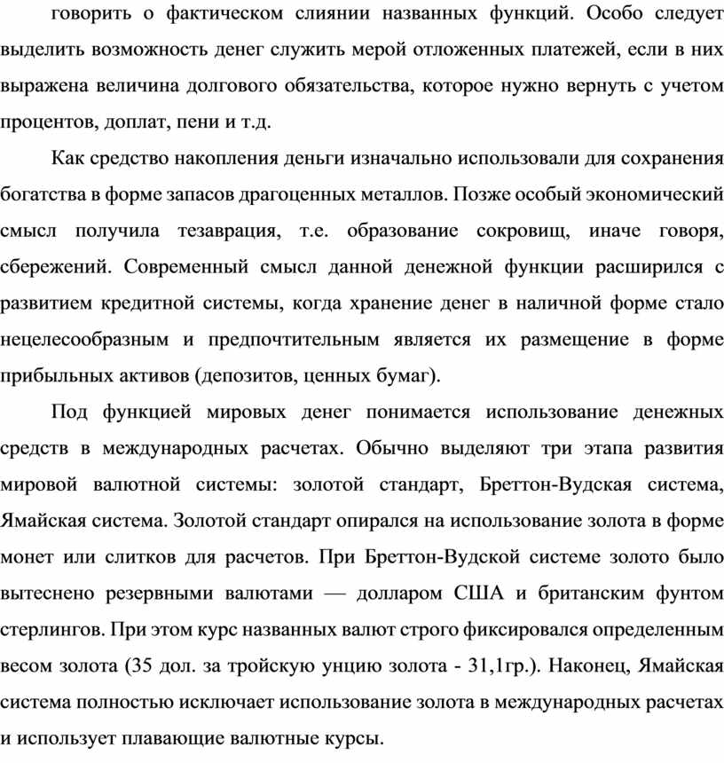 Под функцией мировых денег понимается использование денежных средств в международных расчетах. Обычно выделяют три этапа развития мировой валютной системы: золотой стандарт, Бреттон-Вудская система, Ямайская система. Золотой стандарт опирался на использование золота в форме монет или слитков для расчетов. При Бреттон-Вудской системе золото было вытеснено резервными валютами — долларом США и британским фунтом стерлингов. При этом курс названных валют строго фиксировался определенным весом золота (35 дол. за тройскую унцию золота - 31,1гр.). Наконец, Ямайская система полностью исключает использование золота в международных расчетах и использует плавающие валютные курсы.
