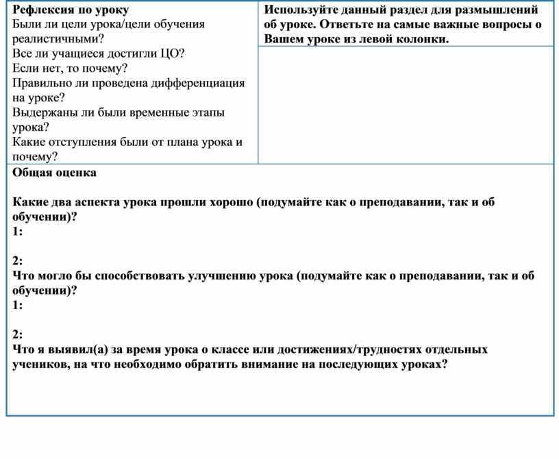 Используйте данный раздел для размышлений об уроке. Ответьте на самые важные вопросы о Вашем уроке из левой колонки. |