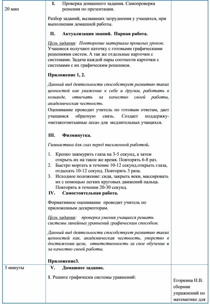 I. Проверка домашнего задания. Самопроверка решения по презентации. Разбор заданий, вызвавших затруднения у учащихся, при выполнении домашней работы. II. Актуализация знаний. Парная работа. Цель задания: Повторение материала прошлых уроков. Учашиеся получают каточку с готовыми графическими решениями систем. А так же отдельные карточки с системами. Задача каждой пары соотнести карточки с системами с их графическим решением. Приложение 1, 2. Данный вид деятельности способствует развитию таких ценностей как уважение к себе и другим, работать в команде, отвечать за качество своей работы, академическая честность. Оценивание проводит учитель по готовым ответам, дает учащимся обратную связь. Создает поддержку- «метакогнитывные леса» для медлительных учащихся.