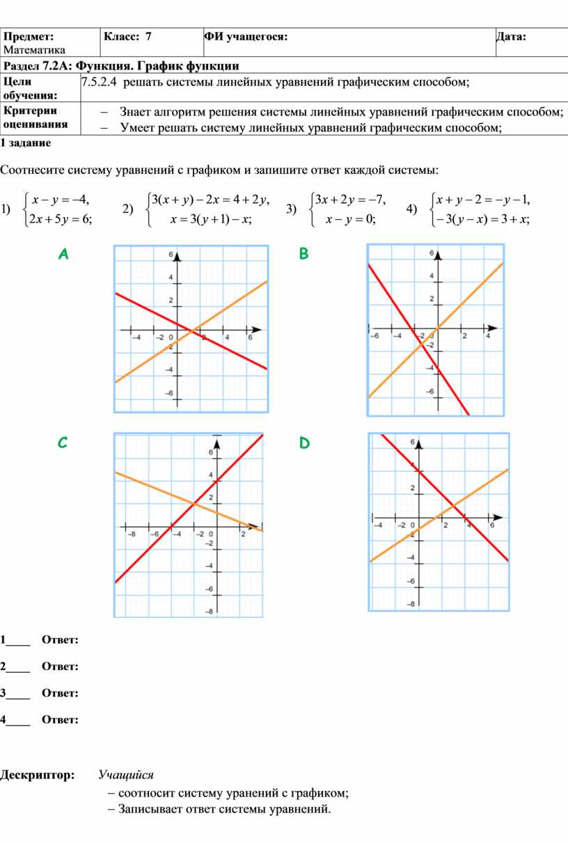 Соотнесите систему уравнений с графиком и запишите ответ каждой системы: