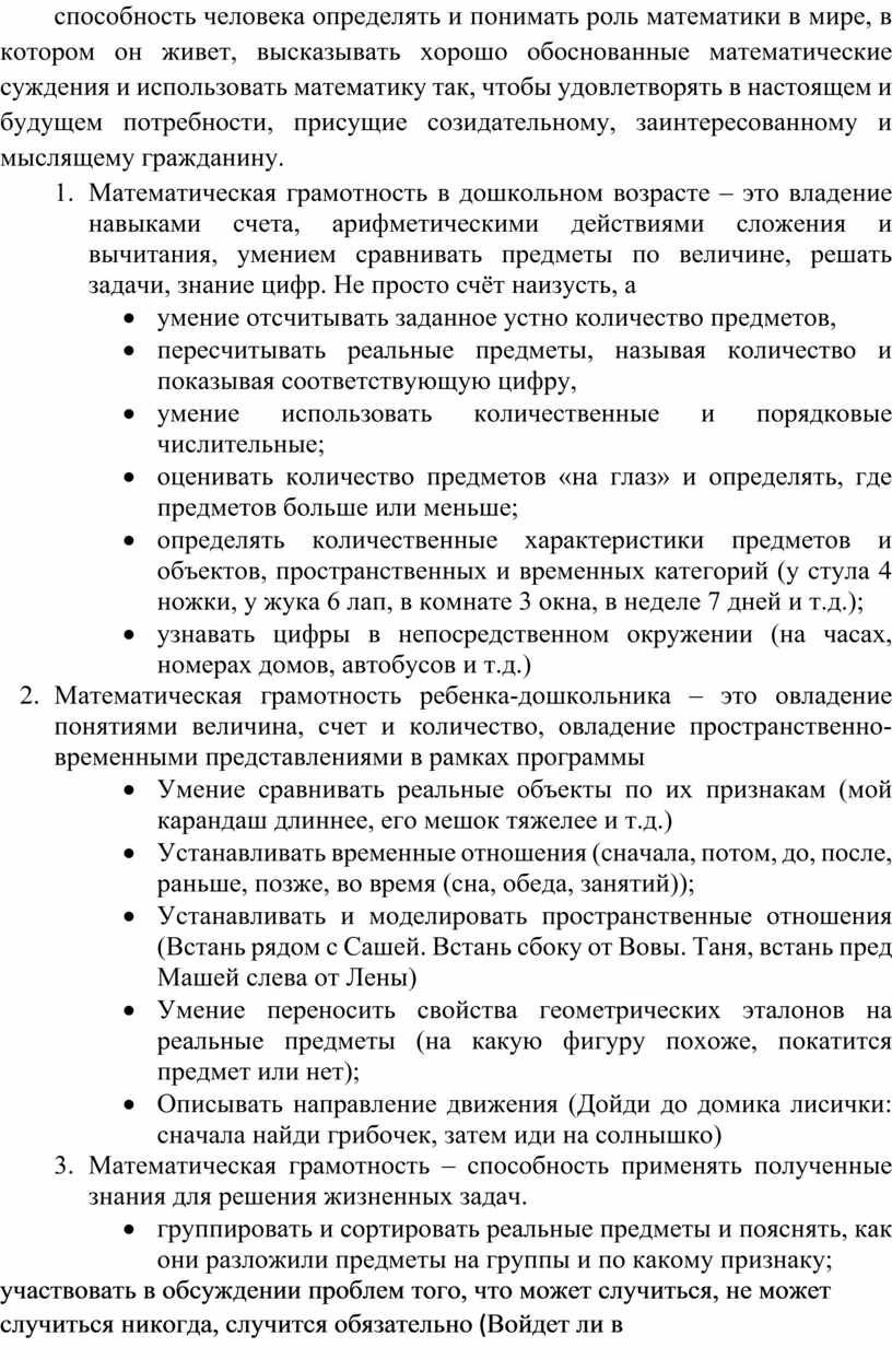 1. Математическая грамотность в дошкольном возрасте – это владение навыками счета, арифметическими действиями сложения и вычитания, умением сравнивать предметы по величине, решать задачи, знание цифр. Не просто счёт наизусть, а