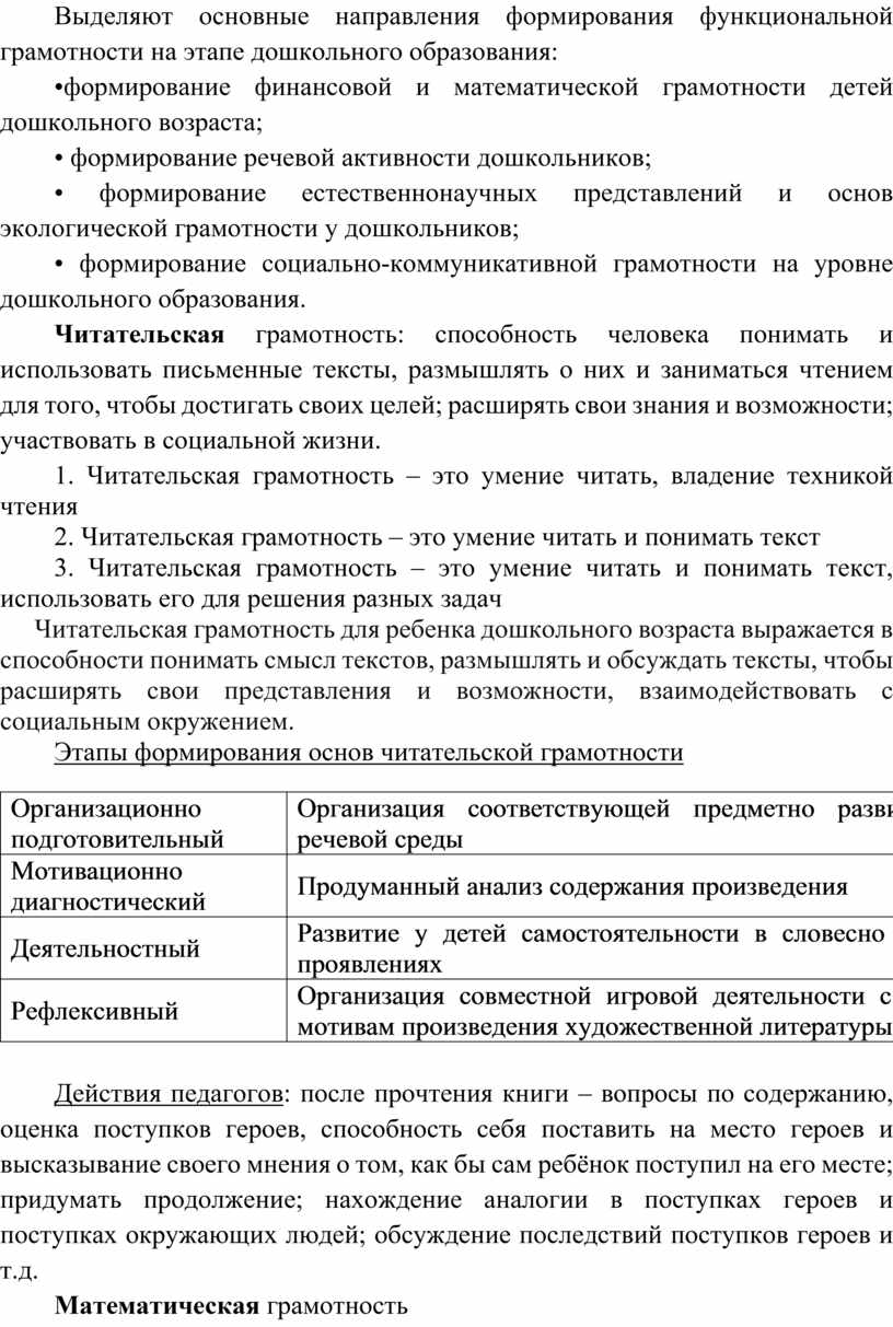 Дошкольное образование является базисом для формирования функциональной грамотности ребенка в условиях реализации ФГОС ДО. Выделяют основные направления формирования функциональной грамотности на этапе дошкольного образования: