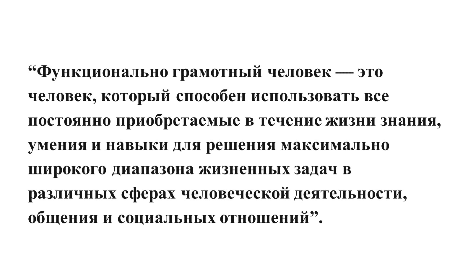 “Функционально грамотный человек — это человек, который способен использовать все постоянно приобретаемые в течение жизни знания, умения и навыки для решения максимально широкого диапазона жизненных задач в различных сферах человеческой деятельности, общения и социальных отношений”.
