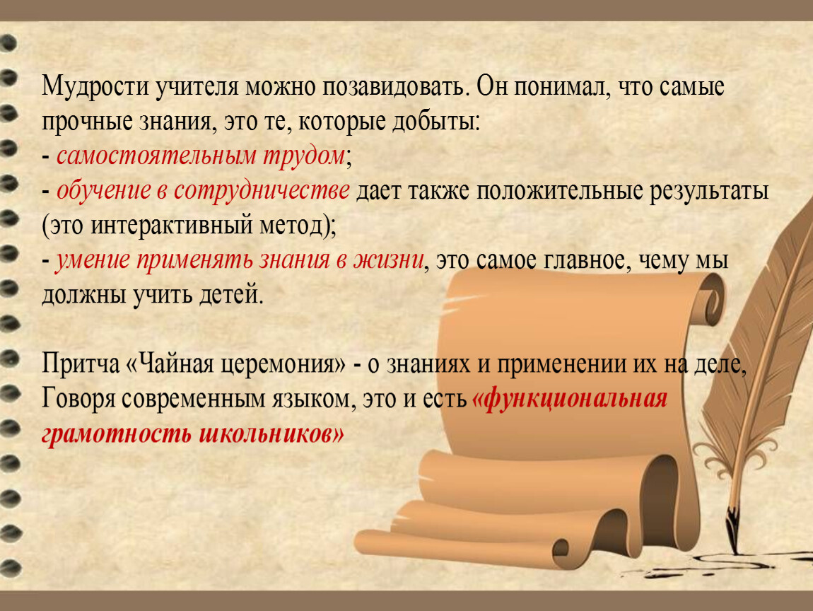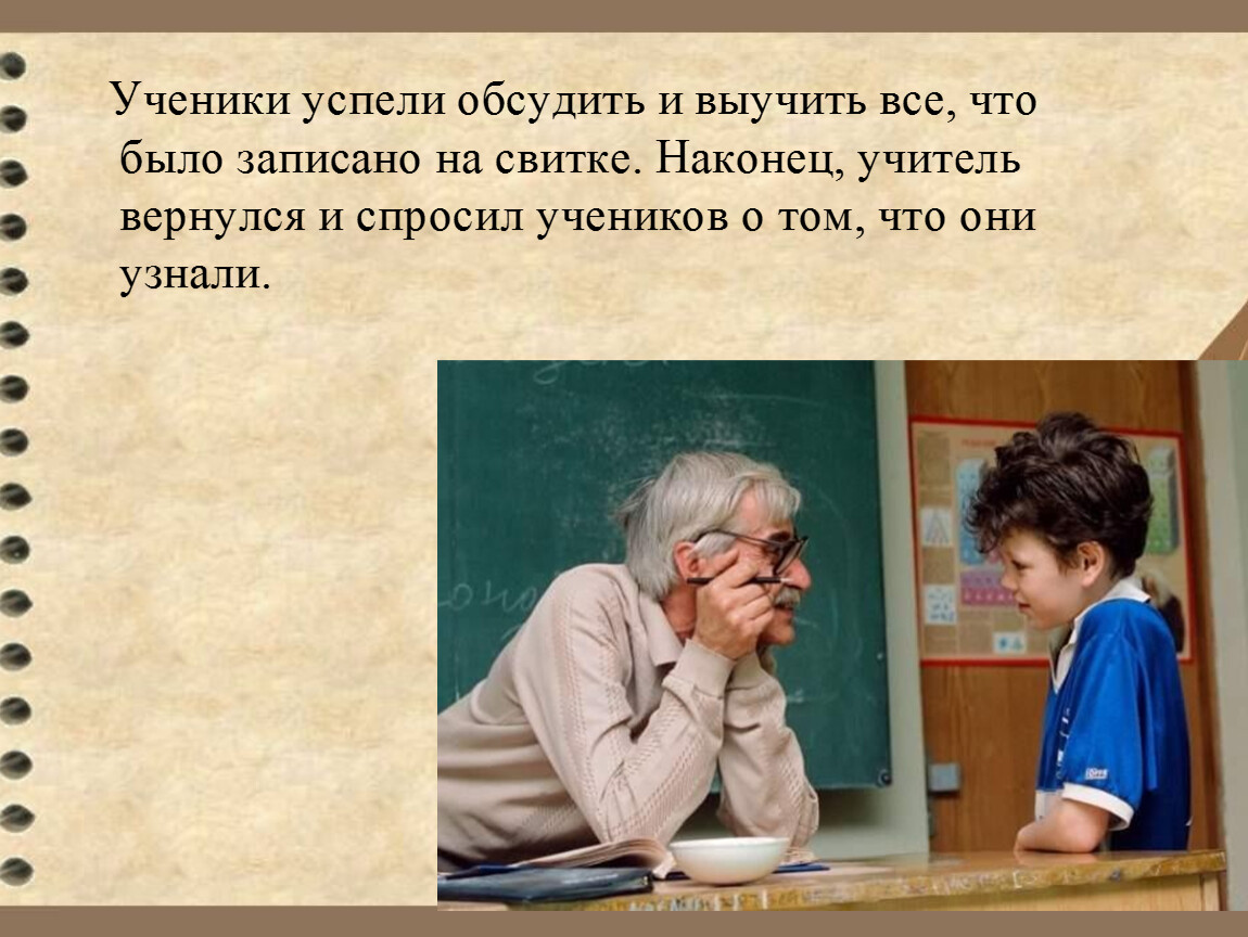 — Твой рассказ был лучшим, – похвалил учитель последнего ученика. – Ты порадовал меня вкусным чаем, и тем, что постиг важное