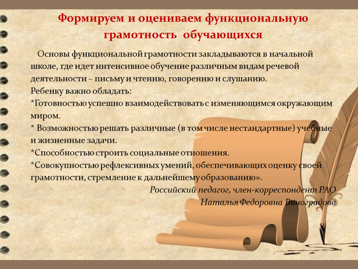 Основы функциональной грамотности закладываются в начальной школе, где идет интенсивное обучение различным видам речевой деятельности – письму и чтению, говорению и слушанию.