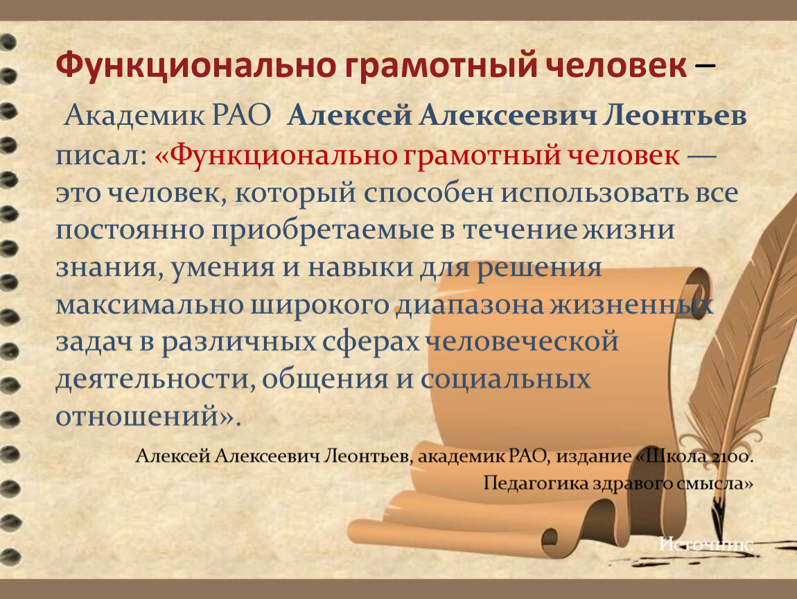 Академик РАО Алексей Алексеевич Леонтьев писал: «Функционально грамотный человек — это человек, который способен использовать все постоянно приобретаемые в течение жизни знания, умения и навыки для решения максимально широкого диапазона жизненных задач в различных сферах человеческой деятельности, общения и социальных отношений».