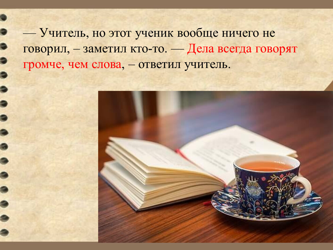 — Учитель, но этот ученик вообще ничего не говорил, – заметил кто-то. — Дела всегда говорят громче, чем слова, – ответил учитель.