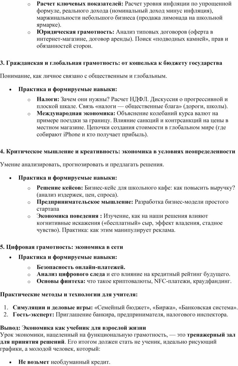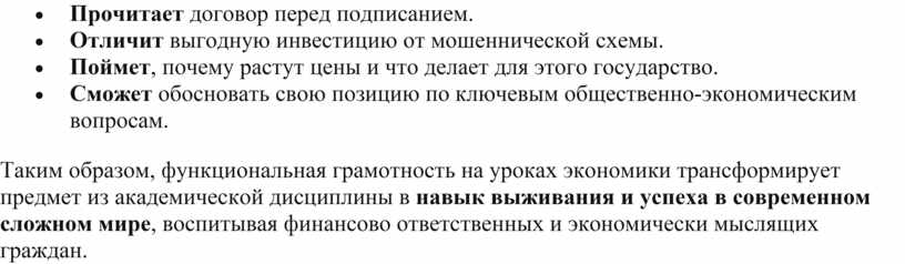 Таким образом, функциональная грамотность на уроках экономики трансформирует предмет из академической дисциплины в навык выживания и успеха в современном сложном мире, воспитывая финансово ответственных и экономически мыслящих граждан.