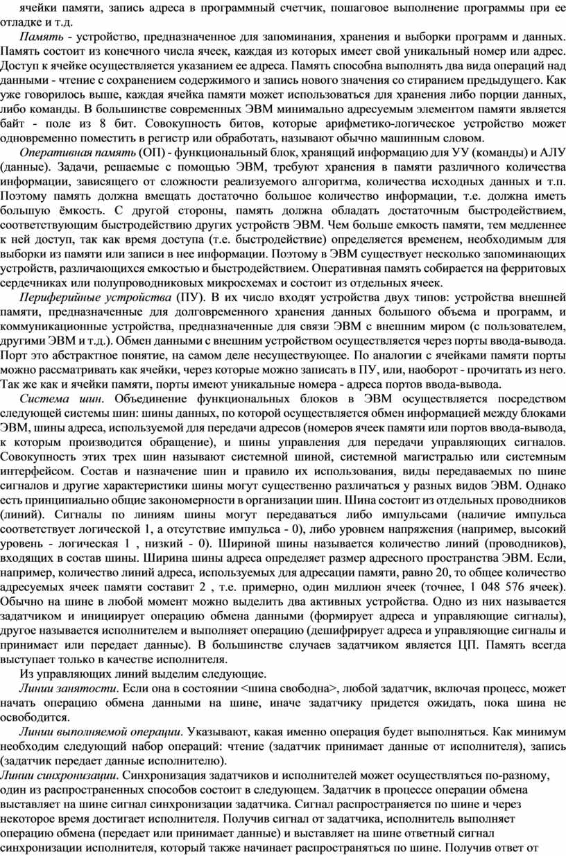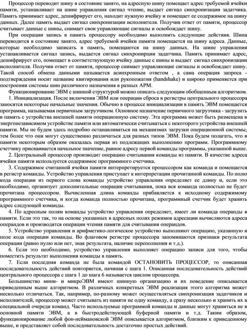 Большинство мини- и микроЭВМ имеют шинную организацию и их поведение описывается приведенным выше алгоритмом. В различных конкретных ЭВМ реализация этого алгоритма может несколько отличаться. Так, например, по-разному может осуществляться синхронизация задатчиков и исполнителей, процессор может считывать из памяти не одну команду, а сразу несколько и хранить их в специальной очереди команд. Часто используемые программой команды и данные могут храниться не в основной памяти ЭВМ, а в быстродействующей буферной памяти и т.д. Таким образом, функционирование любой фон-неймановской ЭВМ описывается алгоритмом, близким к приведенному выше, и представляет собой последовательность достаточно простых действий.