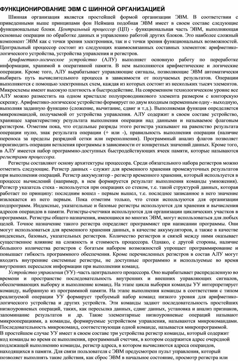 Шинная организация является простейшей формой организации ЭВМ. В соответствии с приведенными выше принципами фон Неймана подобная ЭВМ имеет в своем составе следующие функциональные блоки. Центральный процессор (ЦП) - функциональная часть ЭВМ, выполняющая основные операции по обработке данных и управлению работой других блоков. Это наиболее сложный компонент ЭВМ как с точки зрения электроники, так и с точки зрения функциональных возможностей. Центральный процессор состоит из следующих взаимосвязанных составных элементов: арифметико-логического устройства, устройства управления и регистров.