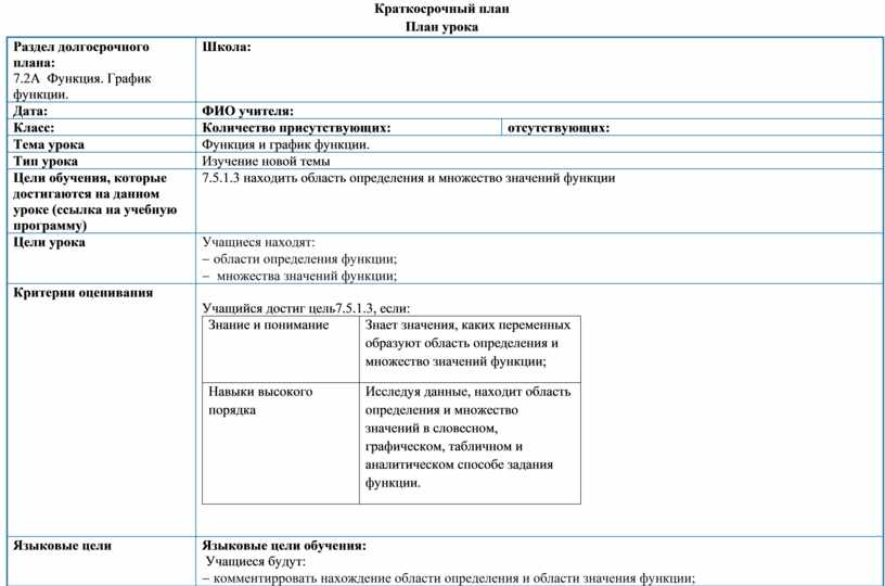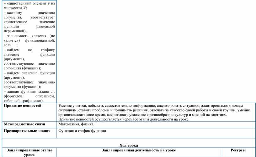 Языковые цели обучения: Учащиеся будут: - комментирровать нахождение области определения и области значения функции; - использовать математическую терминологию и символику при выполнении заданий раздела; Предметная лексика и терминология: - зависимость; - функция, зависимая переменная; - аргумент, независимая переменная; - значение функции; - область определения функции; - множество (область) значений функции; - способы задания функции; - график функции. Серия полезных фраз для диалога/письма: - каждому элементу х из некоторого множества Х ставится в соответствие единственный элемент у из множества У; - каждому значению аргумента, соответствует единственное значение функции (зависимой переменной); - зависимость является (не является) функциональной, если …; - найдем по графику значение функции (аргумента), соответствующее значению аргумента (функции); - найдем значение функции (аргумента), соответствующее значению аргумента (функции); - данная функция задана … (формулой, описанием, таблицей, графически). |