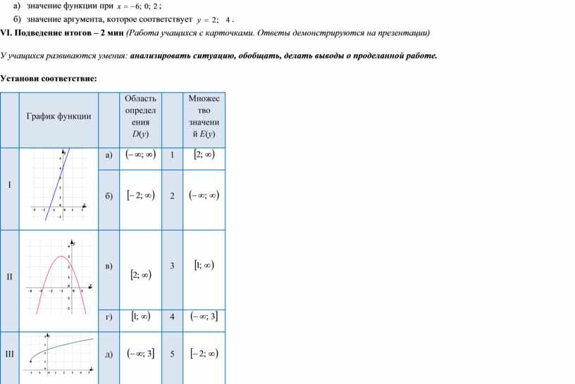 значение аргумента, которое соответствует VI. Подведение итогов – 2 мин (Работа учащихся с карточками. Ответы демонстрируются на презентации) У учащихся развиваются умения: анализировать ситуацию, обобщать, делать выводы о проделанной работе. Установи соответствие: