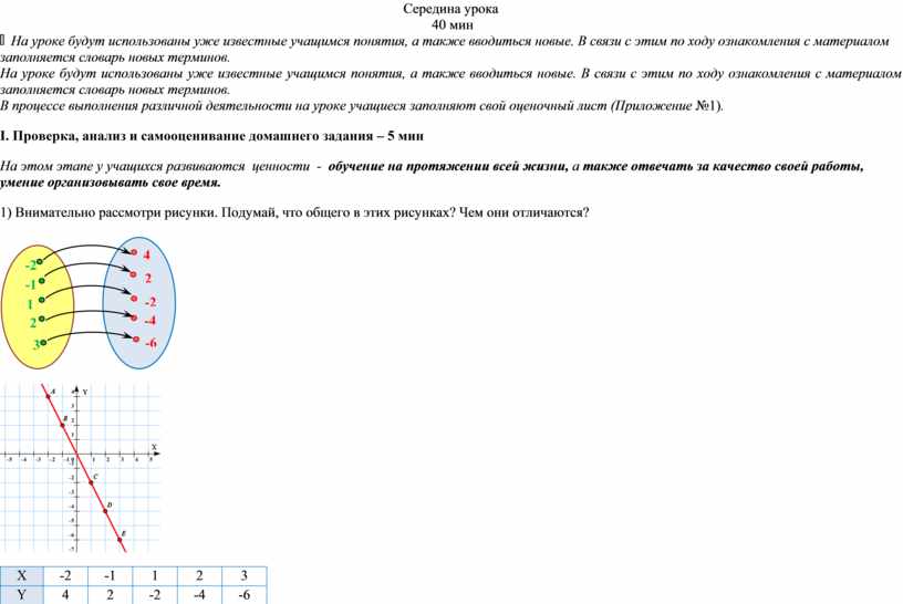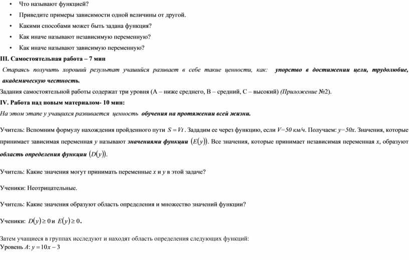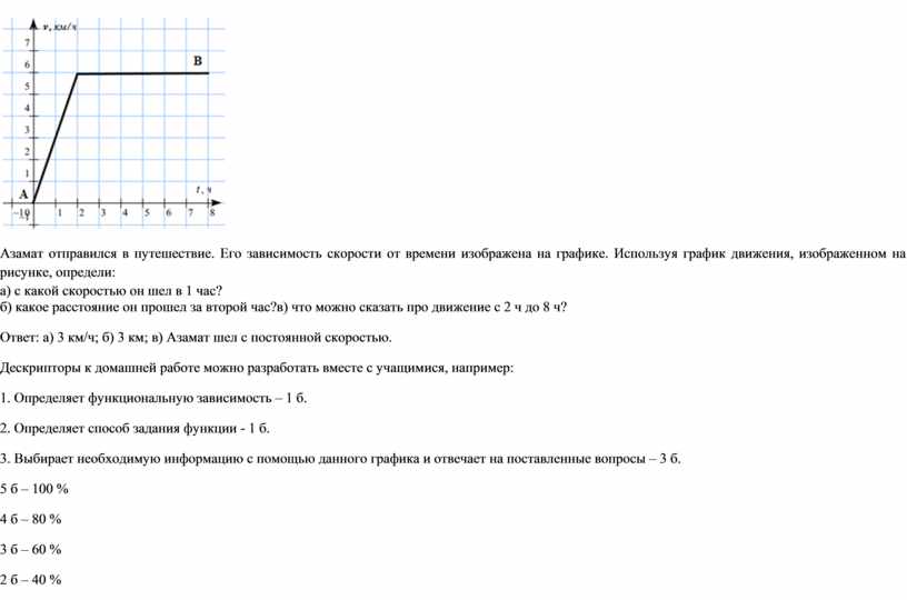 Азамат отправился в путешествие. Его зависимость скорости от времени изображена на графике. Используя график движения, изображенном на рисунке, определи: а) с какой скоростью он шел в 1 час? б) какое расстояние он прошел за второй час?в) что можно сказать про движение с 2 ч до 8 ч? Ответ: а) 3 км/ч; б) 3 км; в) Азамат шел с постоянной скоростью. Дескрипторы к домашней работе можно разработать вместе с учащимися, например: 1. Определяет функциональную зависимость – 1 б. 2. Определяет способ задания функции - 1 б. 3. Выбирает необходимую информацию с помощью данного графика и отвечает на поставленные вопросы – 3 б. 5 б – 100 % 4 б – 80 % 3 б – 60 % 2 б – 40 % 1 б – 20 % 0 б – 0 % II. Повторение ранее изученного материала (устная работа) - 2 мин Привитие ценностей - умение быстро отвечать на поставленные вопросы, анализировать ситуацию, адаптироваться к новым ситуациям. Учитель задает вопросы: • Что называют функцией? • Приведите примеры зависимости одной величины от другой. • Какими способами может быть задана функция? • Как иначе называют независимую переменную? • Как иначе называют зависимую переменную? III. Самостоятельная работа – 7 мин Стараясь получить хороший результат учашийся разивает в себе такие ценности, как: упорство в достижении цели, трудолюбие, академическую честность. Задания самостоятельной работы содержат три уровня (A – ниже среднего, В – средний, С – высокий) (Приложение №2). IV. Работа над новым материалом- 10 мин: На этом этапе у учащихся развивается ценность обучения на протяжении всей жизни. Учитель: