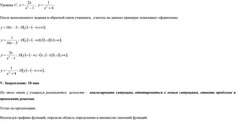 Затем учащиеся в группах исследуют и находят область определения следующих функций: Уровень А: Уровень В: Уровень С: После выполненного задания и обратной связи учащимся, учитель на данных примерах показывает оформление.