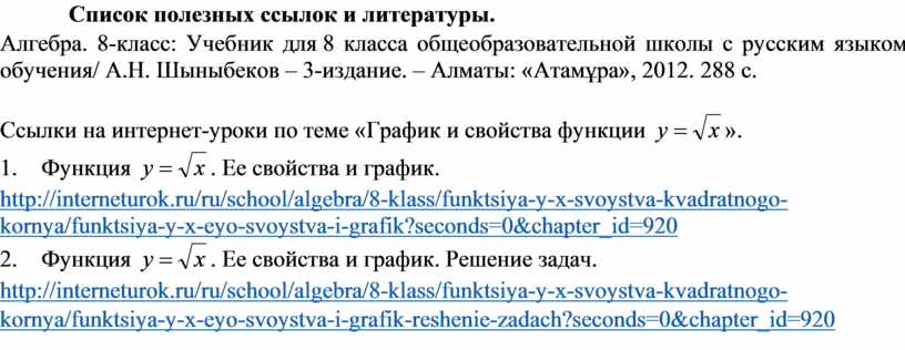 Алгебра. 8-класс: Учебник для 8 класса общеобразовательной школы с русским языком обучения/ А.Н. Шыныбеков – 3-издание. – Алматы: «Атамұра», 2012. 288 с.