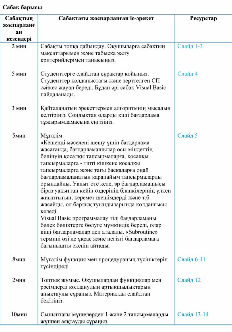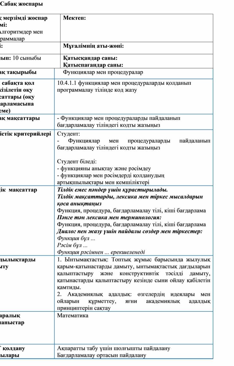 Тілдік емес пәндер үшін құрастырылады. Тілдік мақсаттарды, лексика мен тіркес мысалдарын қоса анықтаңыз Функция, процедура, бағдарламалау тілі, кіші бағдарлама Пәнге тән лексика мен терминология: Функция, процедура, бағдарламалау тілі, кіші бағдарлама Диалог пен жазу үшін пайдалы сөздер мен тіркестер: Функция бұл ... Рәсім бұл ... Функция рәсімнен ... ерекшеленеді |