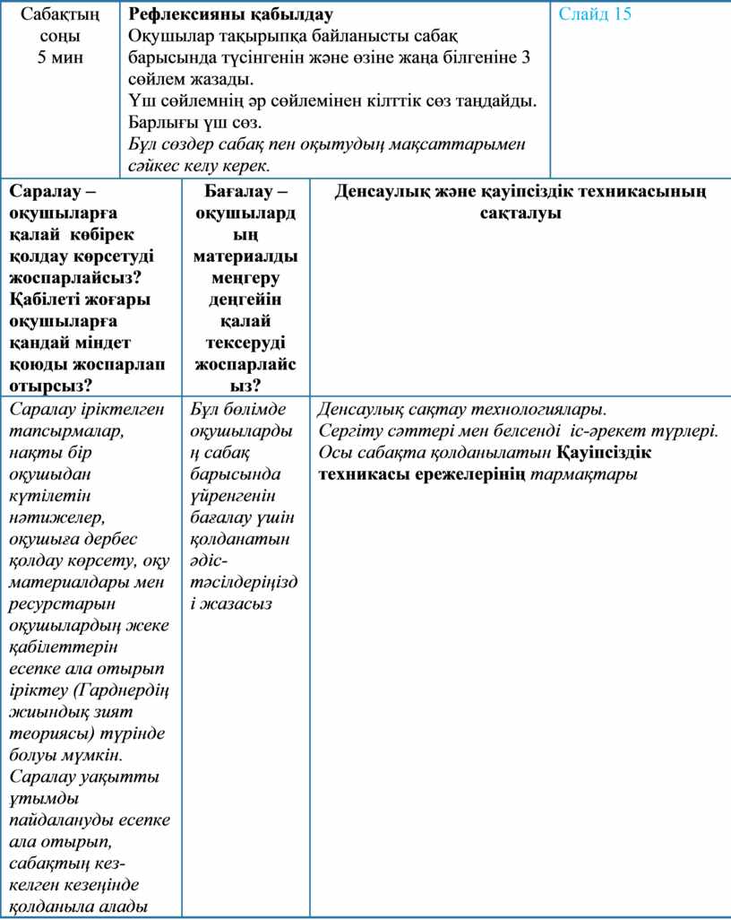 Бұл бөлімде оқушылардың сабақ барысында үйренгенін бағалау үшін қолданатын әдіс-тәсілдеріңізді жазасыз |