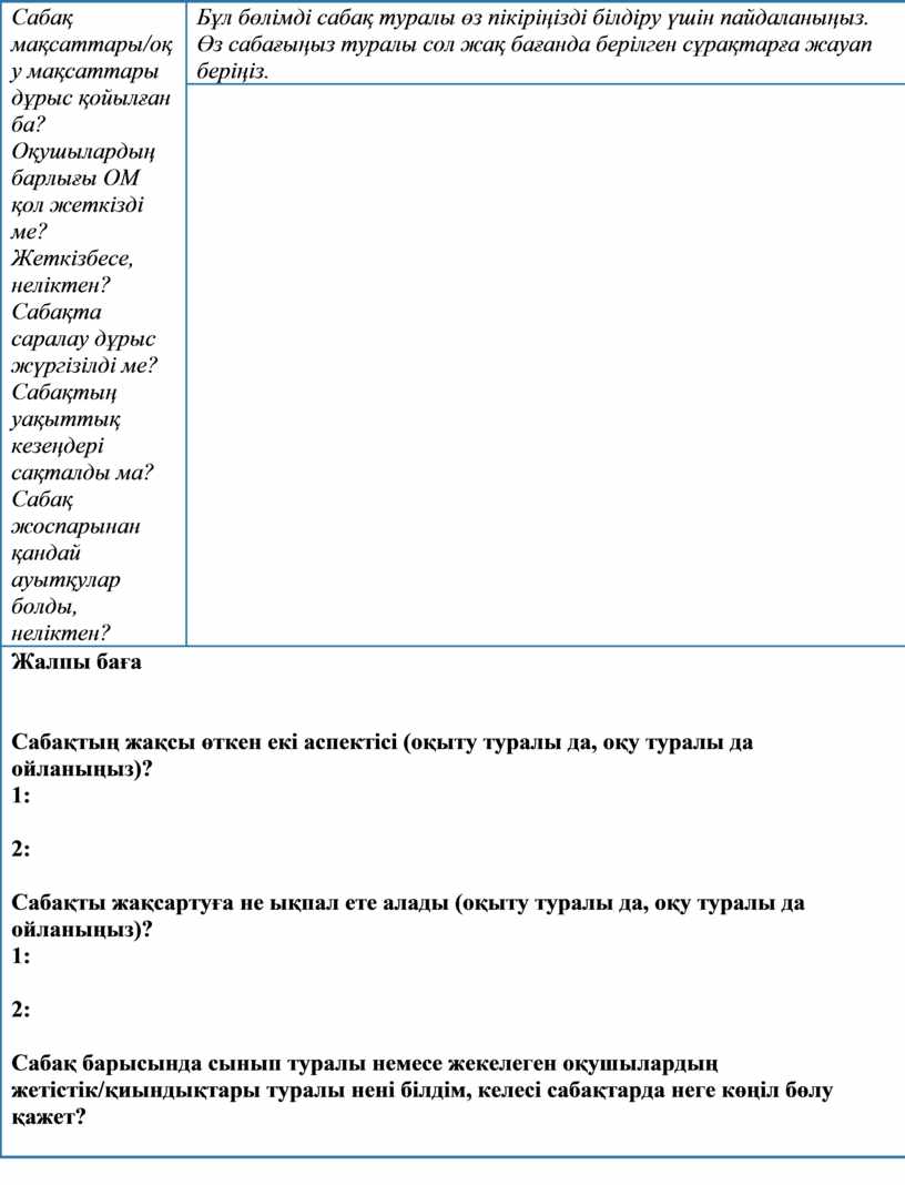Бұл бөлімді сабақ туралы өз пікіріңізді білдіру үшін пайдаланыңыз. Өз сабағыңыз туралы сол жақ бағанда берілген сұрақтарға жауап беріңіз. |