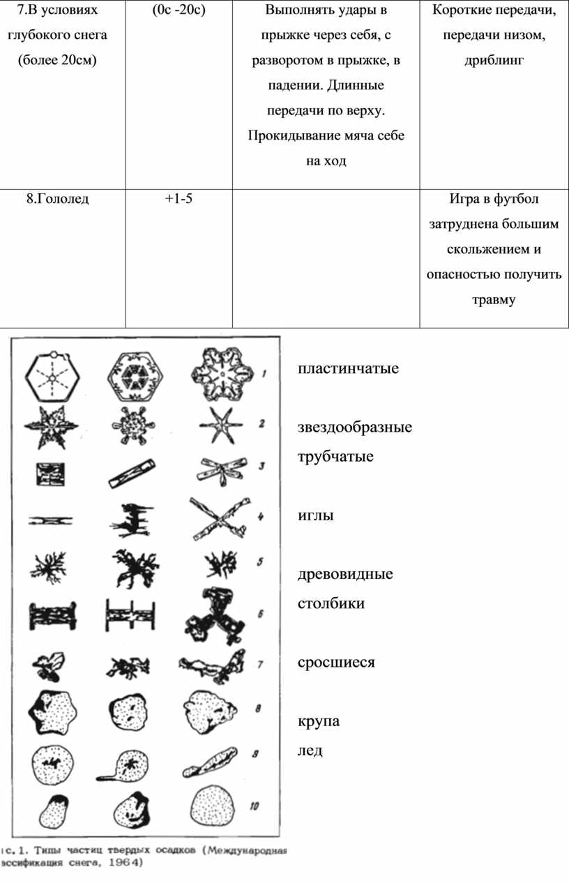 Чтобы лучше понимать, как играть в футбол на снегу надо понимать природу снега и процессы, которые протекают со снегом в период от его выпадения до, того, как он растает. Состав СП зависит от термодинамического равновесия всех трех фаз его состояния (жидкого, твердого, газообразного). Под влиянием постоянно идущих в толще СП процессов режеляции, сублимации, взгонки, рекристаллизации снег приобретает зернистую структуру. Существует несколько классификаций снега: по типу кристаллов, по физическому состоянию на земле и по условиям его залегания. Нас в первую очередь интересует физическое состояние на земле и погодные условия в которых снег залегает. Снег очень изменчивый. Его физические свойства. Такие как плотность, теплопроводимость, теплоемкость, пористость, влажность, скорость распространения звука постоянно меняется. Как правило любой снег проходит несколько стадий своего физического состояния, которые отличаются друг от друга по плотности, содержанию воды и соответственно силе трения. Свежевыпавший снег часто называют «Пухляк» - это недавно выпавший, нетронутый мягкий снег. Если он неглубокий, то играть на таком снегу одно удовольствие. Падения, удары через себя выполнять в таких условиях довольно безопасно.