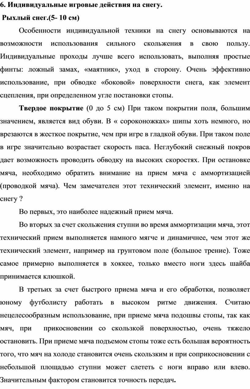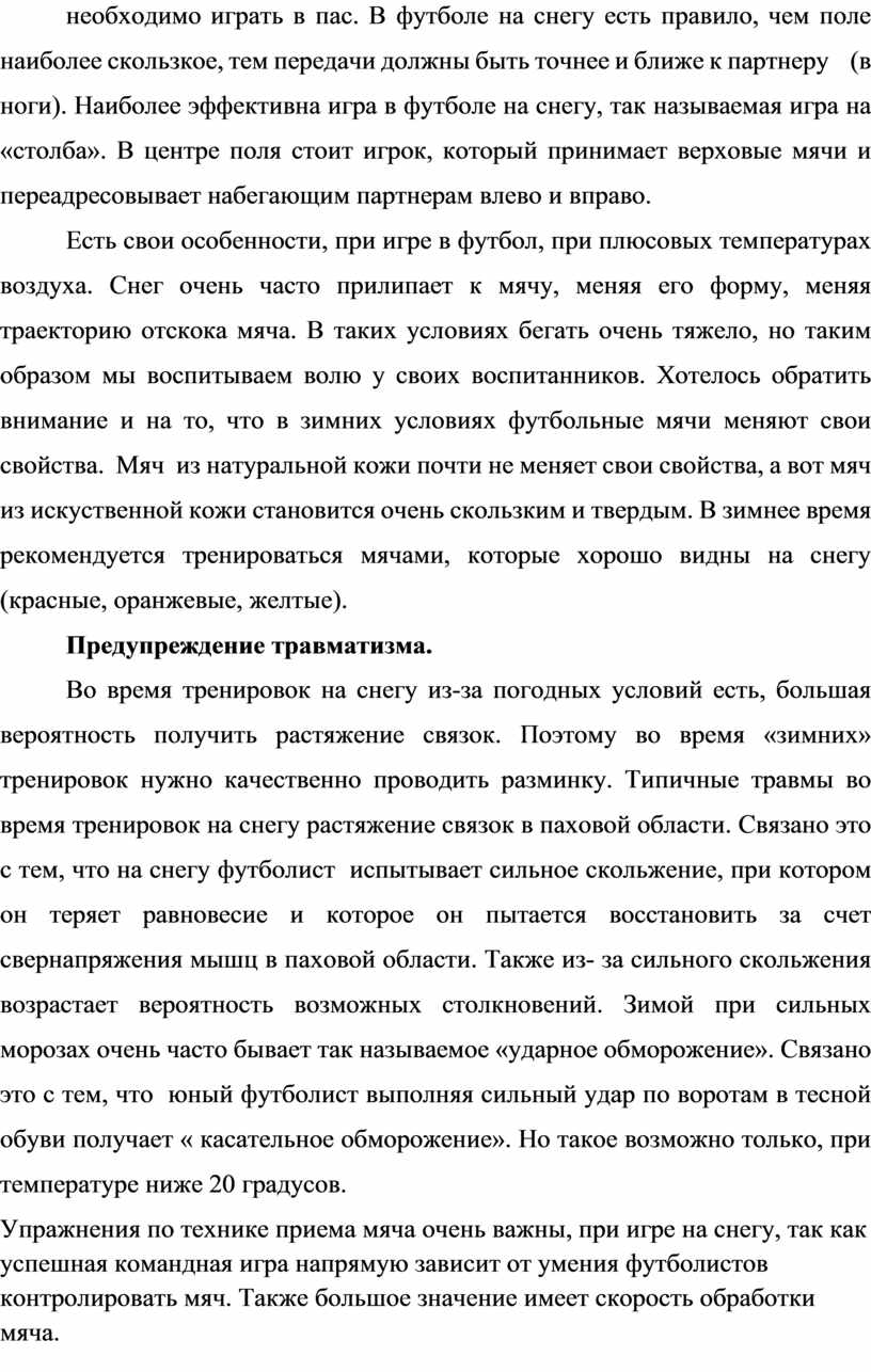 За многие годы игры на снегу сформировались свои специфические особенности игры. Очень велика роль скольжения во время игры на снегу. Поэтому для тренировок очень важно, в каких условиях они протекают. В начале зимы это гололед, затем снег. В программу по футболу в зимнее время были включены технические приемы, которые давали бы возможность развиваться юному футболисту в любых условиях, а особенно для игры на снегу. Многие элементы футбола в тех или иных условиях просто не выполнимы или наоборот находят свою «прелесть».