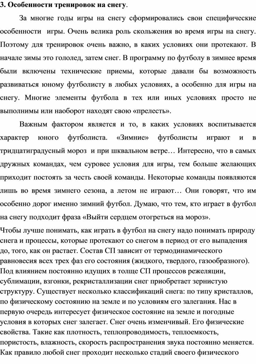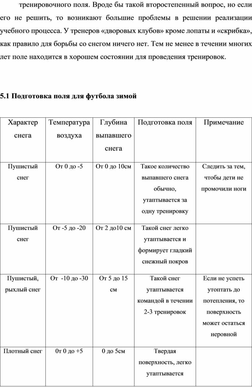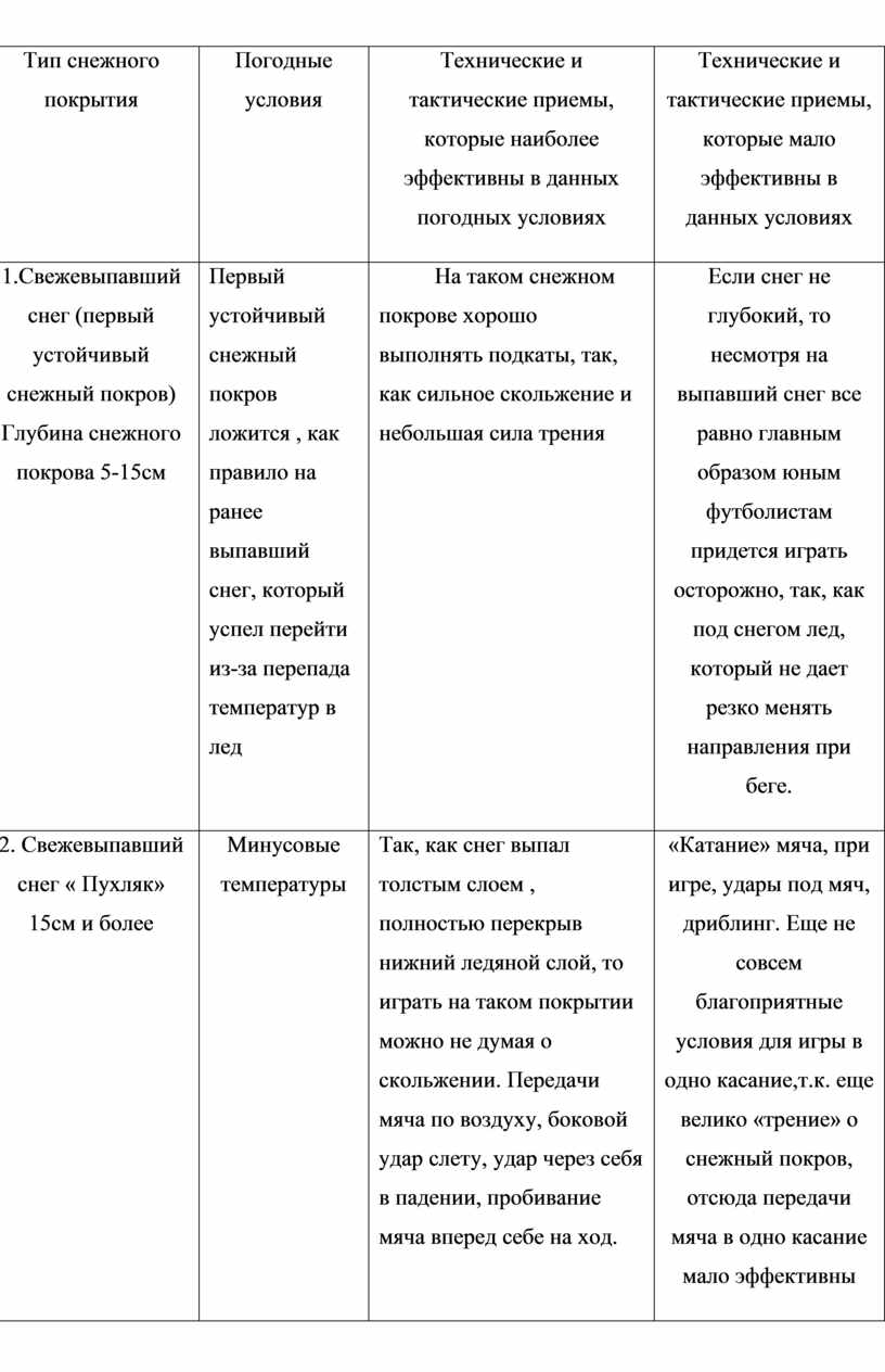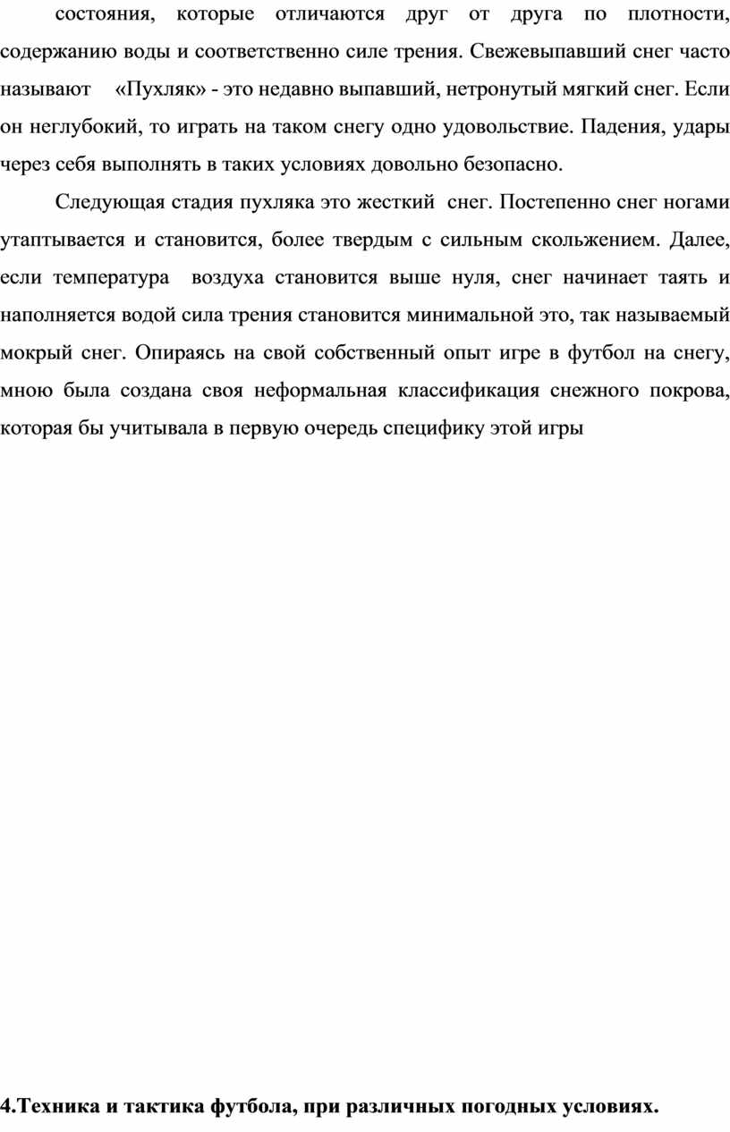 Следующая стадия пухляка это жесткий снег. Постепенно снег ногами утаптывается и становится, более твердым с сильным скольжением. Далее, если температура воздуха становится выше нуля, снег начинает таять и наполняется водой сила трения становится минимальной это, так называемый мокрый снег. Опираясь на свой собственный опыт игре в футбол на снегу, мною была создана своя неформальная классификация снежного покрова, которая бы учитывала в первую очередь специфику этой игры